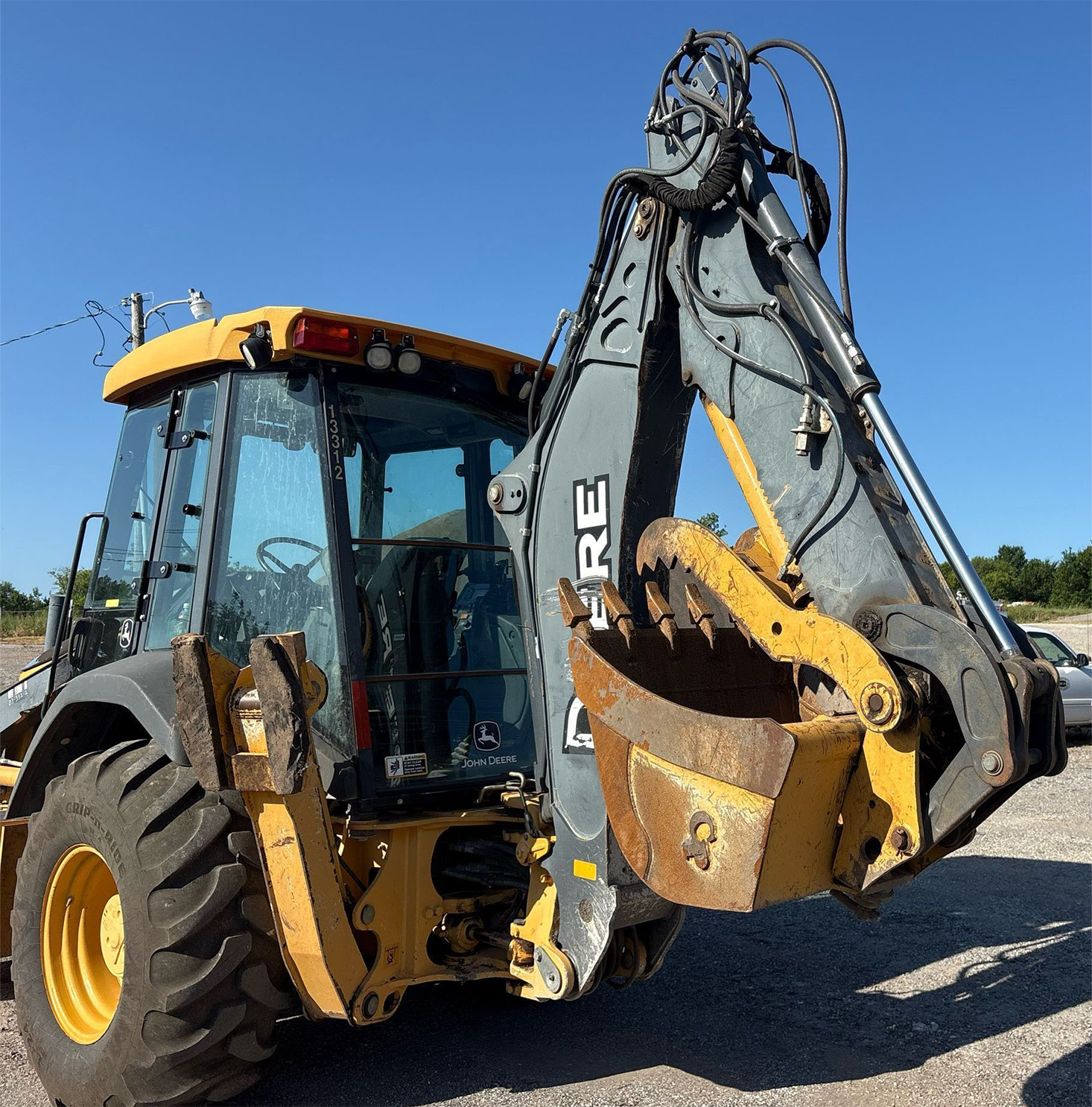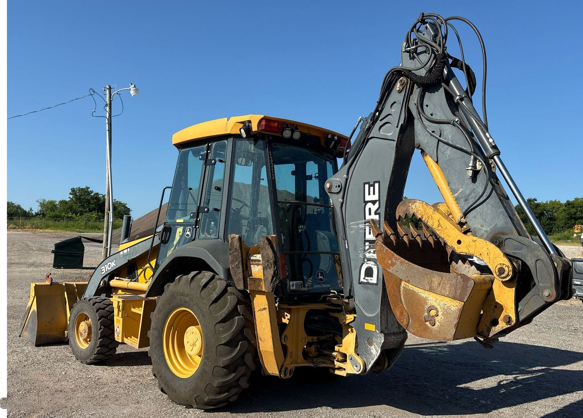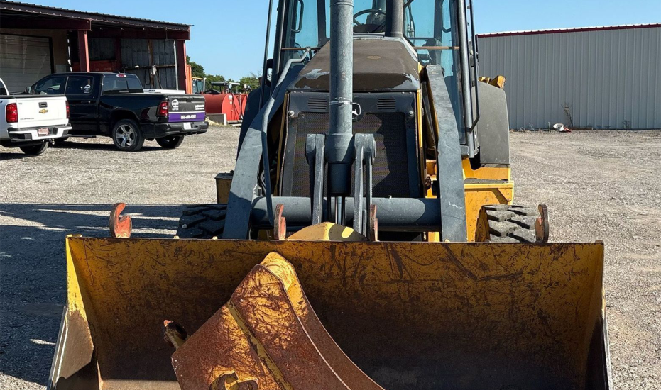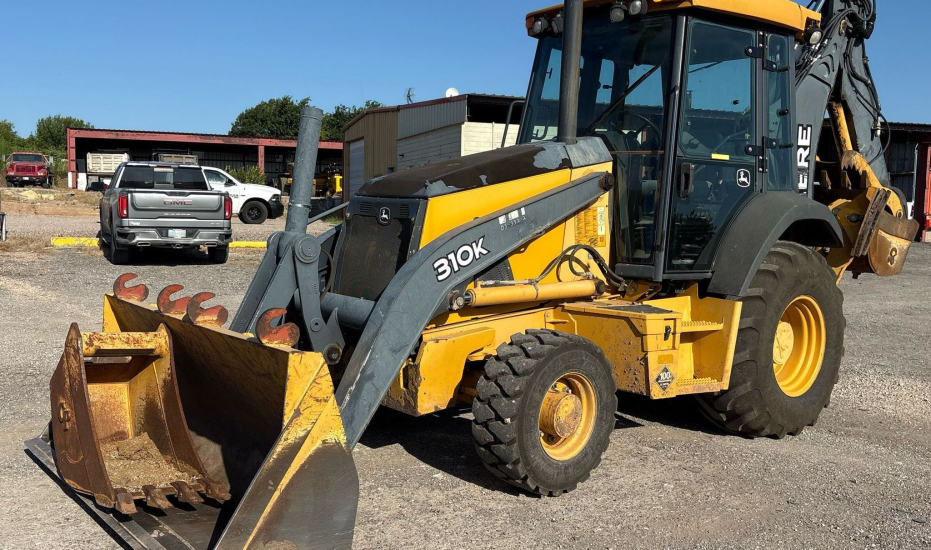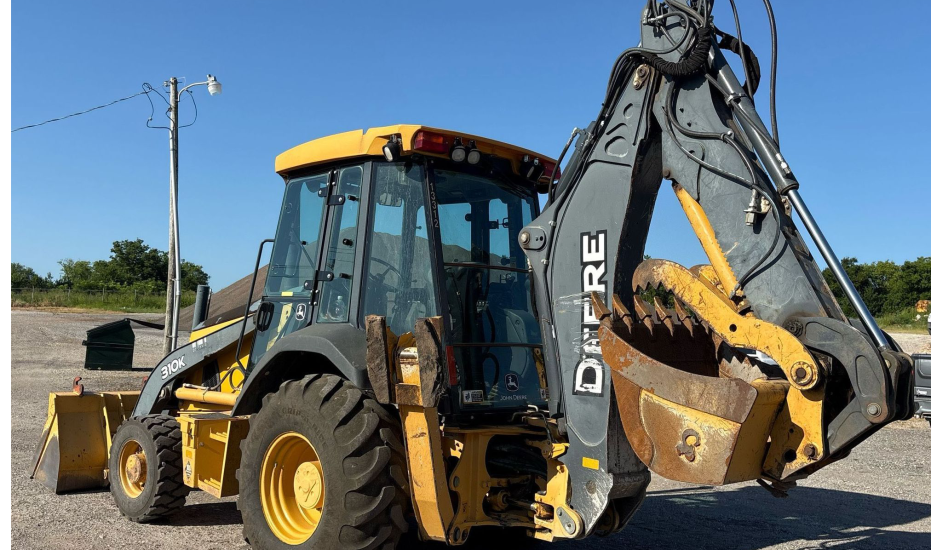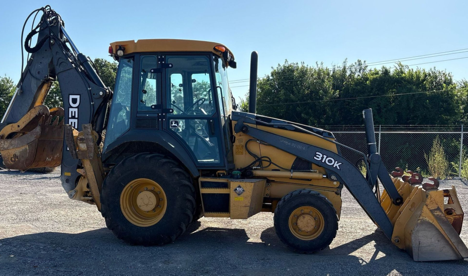 2013 John Deere 310K Backhoe Loader with 2,577 hours. Powered by a dependable John Deere 4045 4.5L diesel engine and powershift transmission (4F/4R). Equipped with 4WD and differential lock for strong traction. Features an enclosed cab with heat and A/C, pilot backhoe controls with pattern changer, and an extendable stick. Includes hydraulic quick coupler, hydraulic thumb, auxiliary hydraulics, and multiple buckets. Loader bucket is 86" wide, 1.12 cu. yd. capacity with bolt-on cutting edge. Job-ready machine ideal for digging, loading, and utility work.