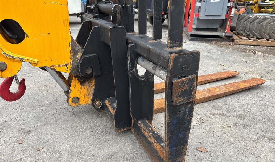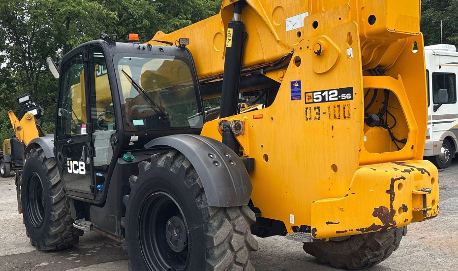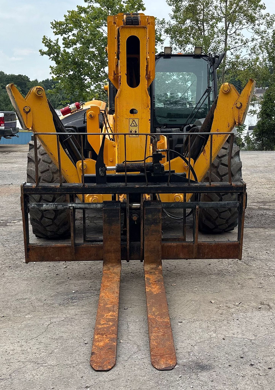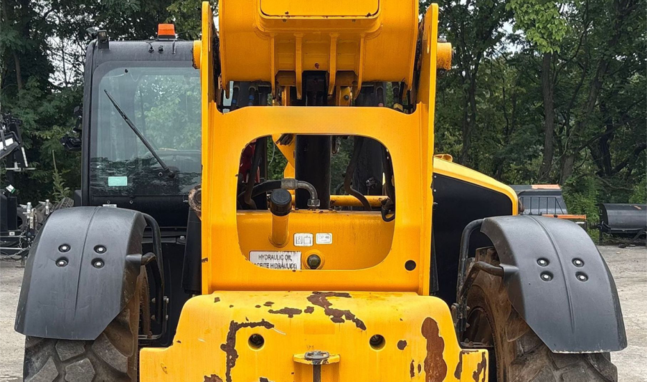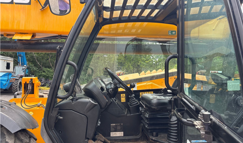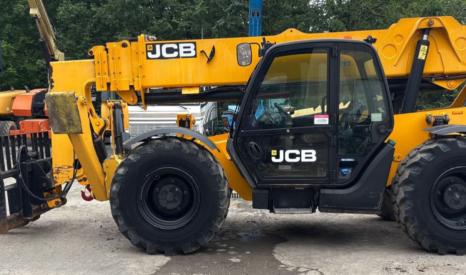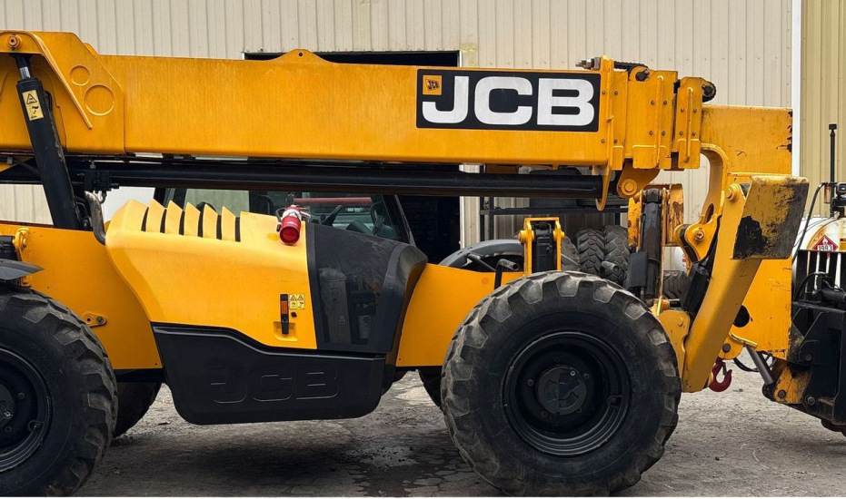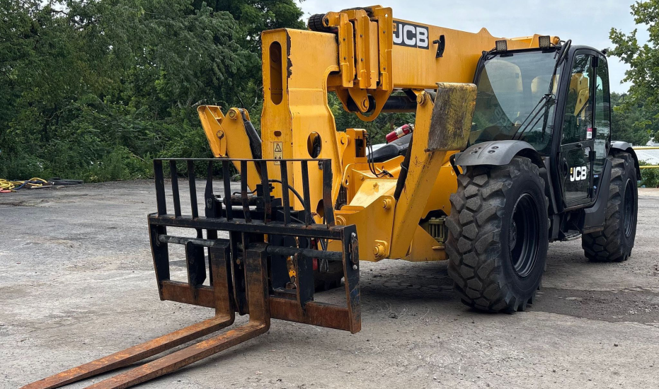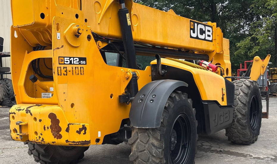 Telehandler with a 4-cylinder diesel engine and powershift transmission (4F/4R). Features 4WD, enclosed cab with AC and heat, and crab/4-wheel steering. Boasts a maximum lift capacity of 12,000 lbs and 56' lift height with a 4-stage boom. Equipped with 60" forks, auxiliary hydraulics, swing and tilt carriage, hydraulic outriggers, hydraulic leveling, and manual quick attach—built for high-reach material handling and versatile jobsite lifting.