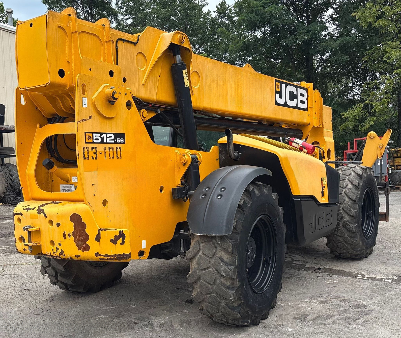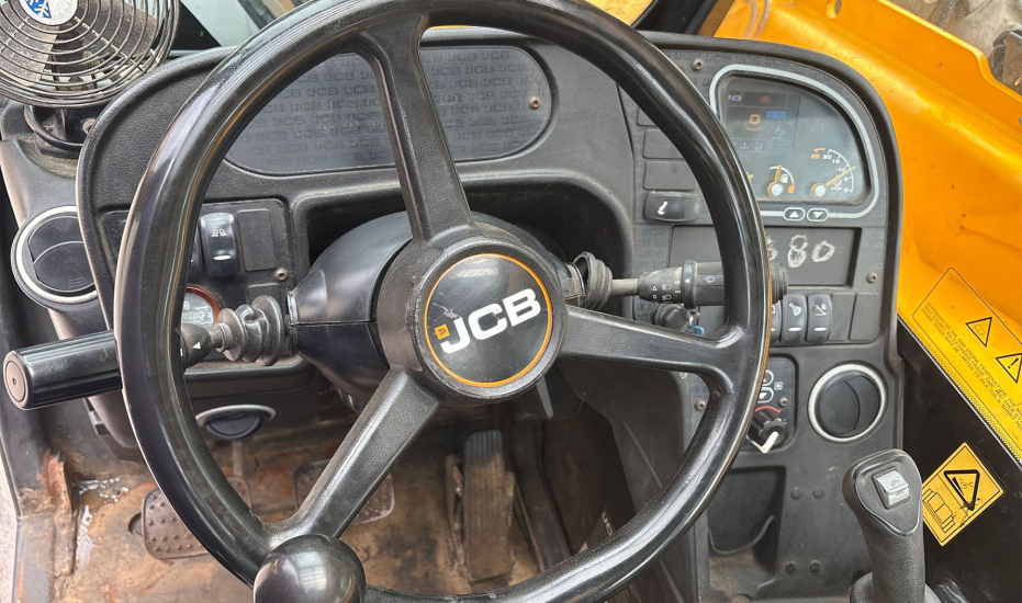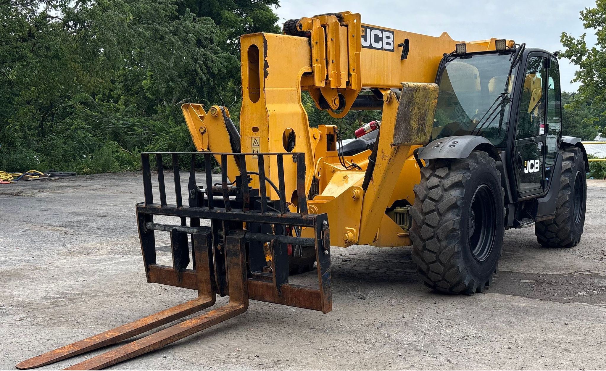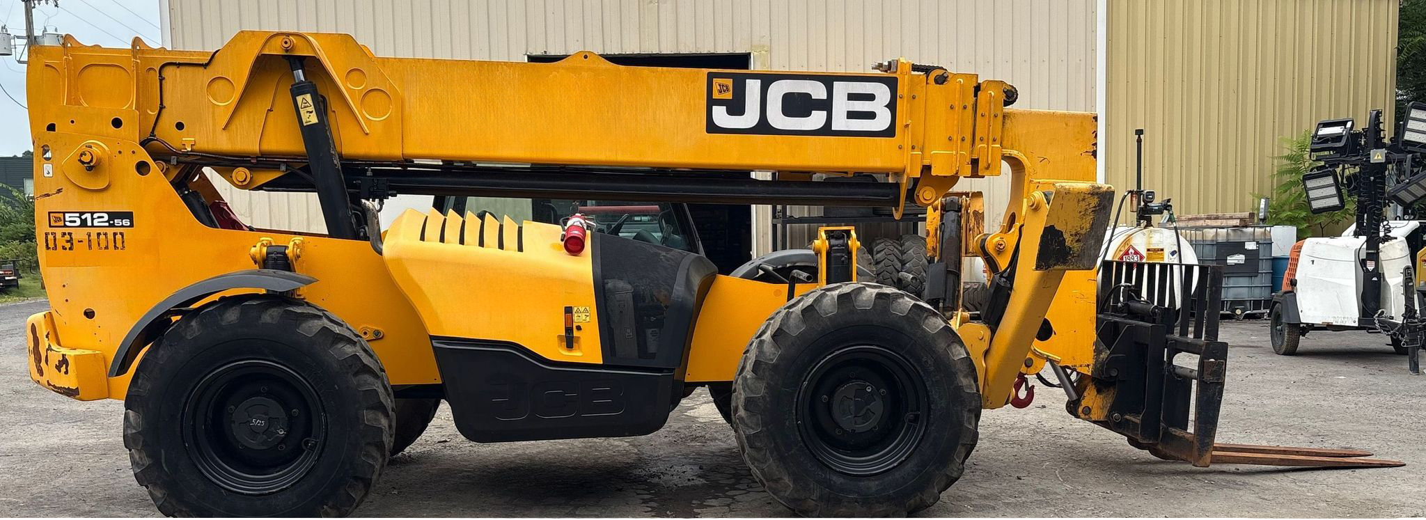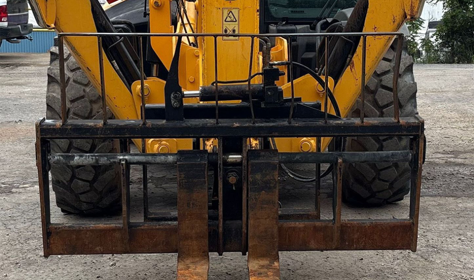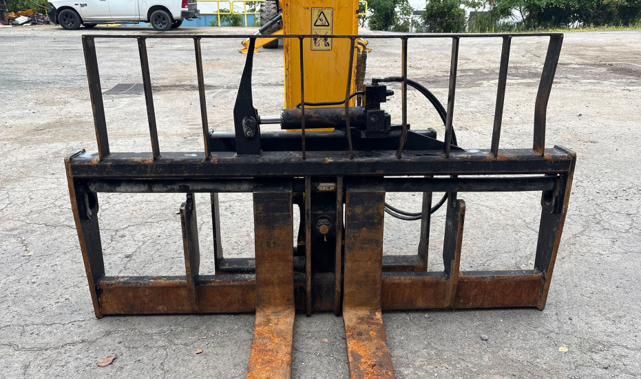 Telehandler with a 4-cylinder diesel engine and powershift transmission (4F/4R). Features 4WD, enclosed cab with AC and heat, and crab/4-wheel steering. Boasts a maximum lift capacity of 12,000 lbs and 56' lift height with a 4-stage boom. Equipped with 60" forks, auxiliary hydraulics, swing and tilt carriage, hydraulic outriggers, hydraulic leveling, and manual quick attach—built for high-reach material handling and versatile jobsite lifting.