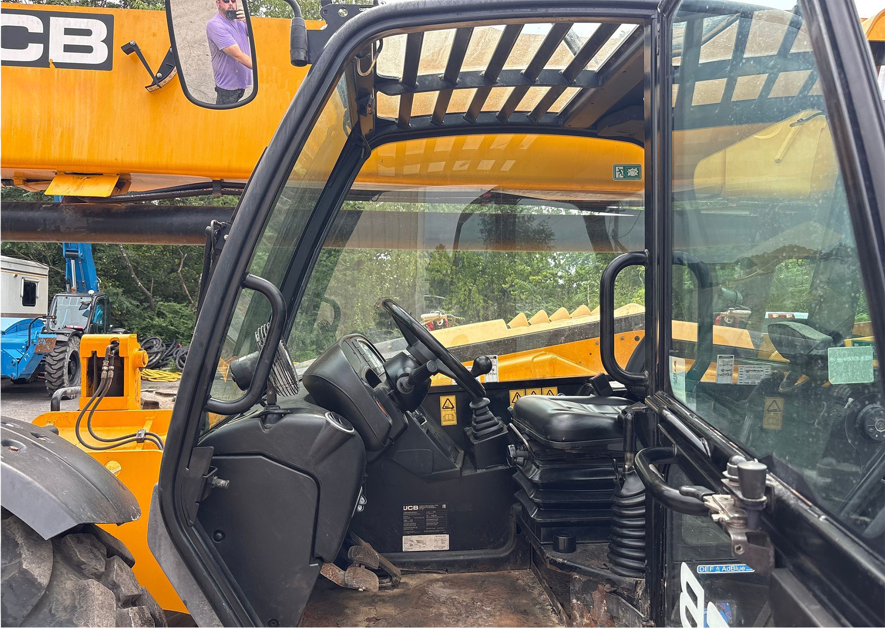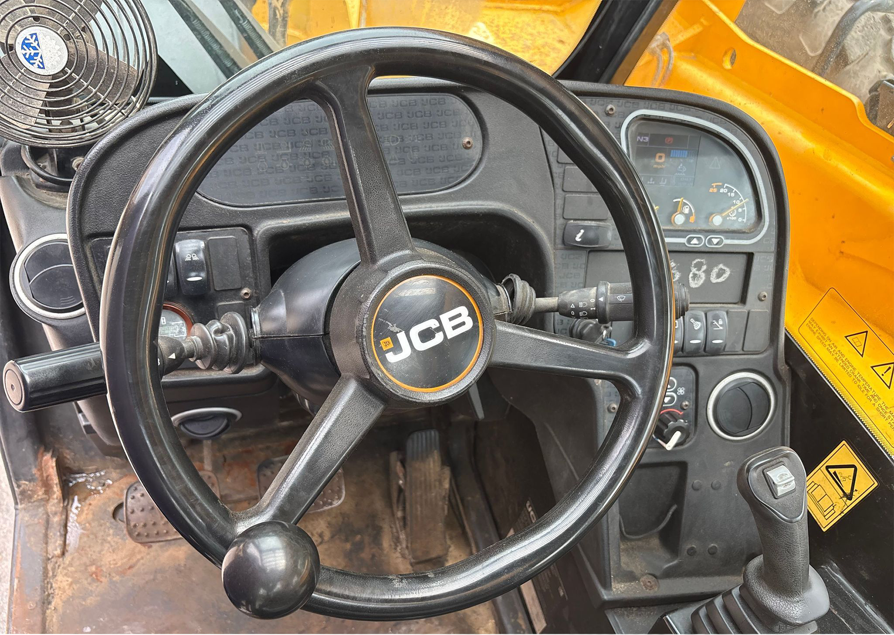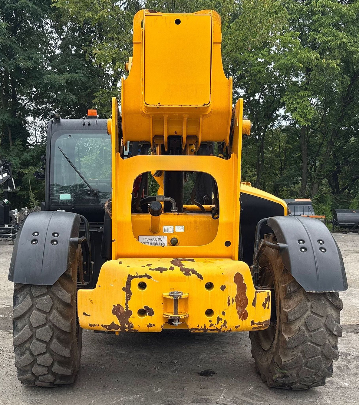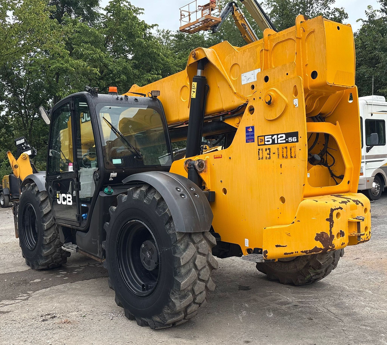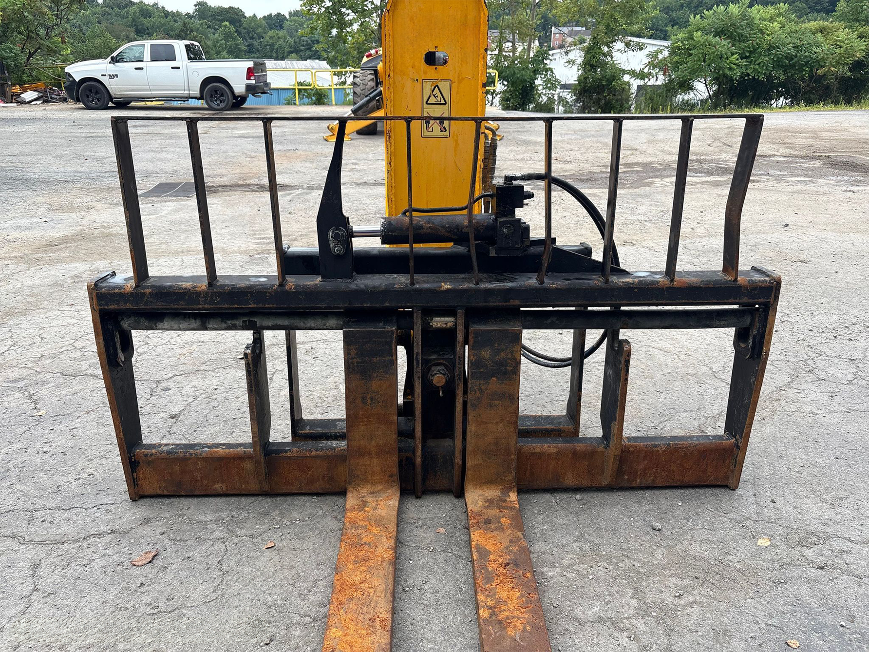 Telehandler with a 4-cylinder diesel engine and powershift transmission (4F/4R). Features 4WD, enclosed cab with AC and heat, and crab/4-wheel steering. Boasts a maximum lift capacity of 12,000 lbs and 56' lift height with a 4-stage boom. Equipped with 60" forks, auxiliary hydraulics, swing and tilt carriage, hydraulic outriggers, hydraulic leveling, and manual quick attach—built for high-reach material handling and versatile jobsite lifting.