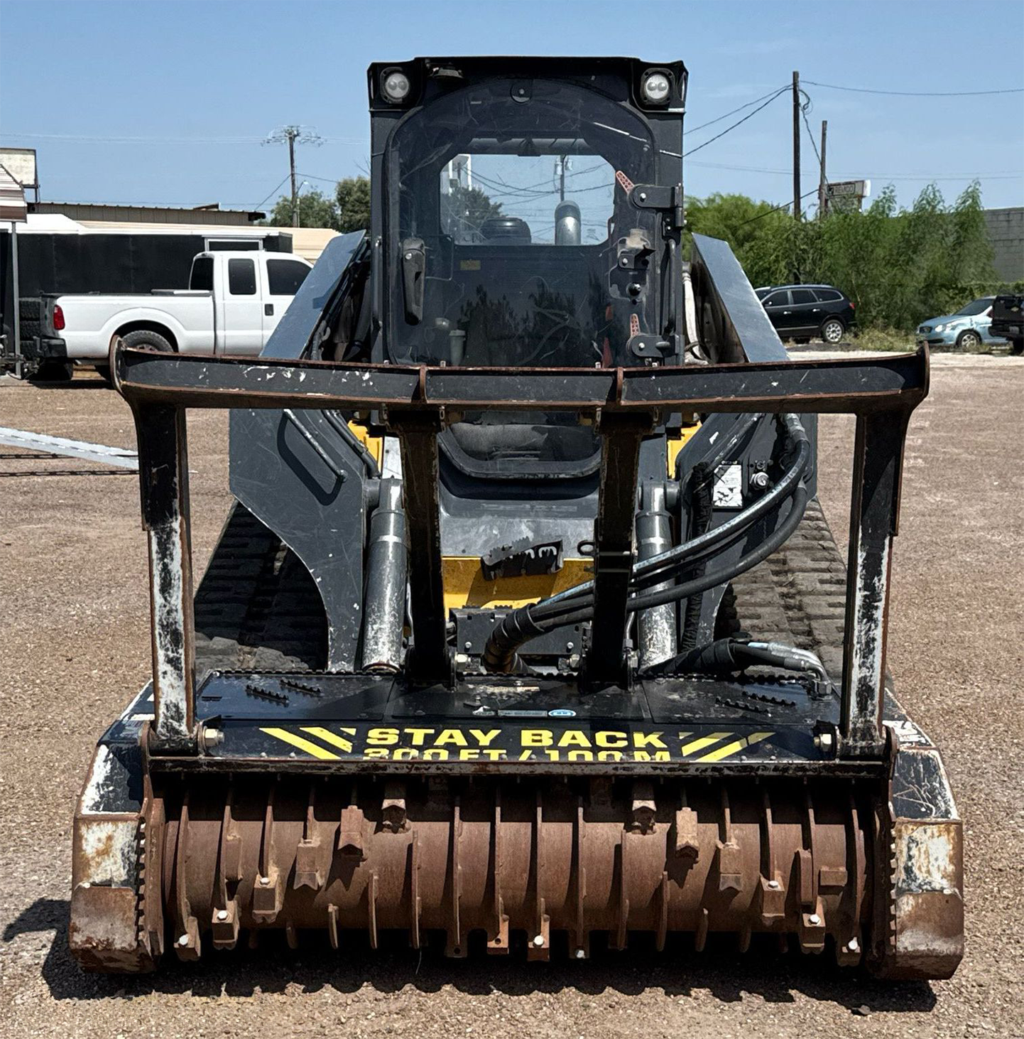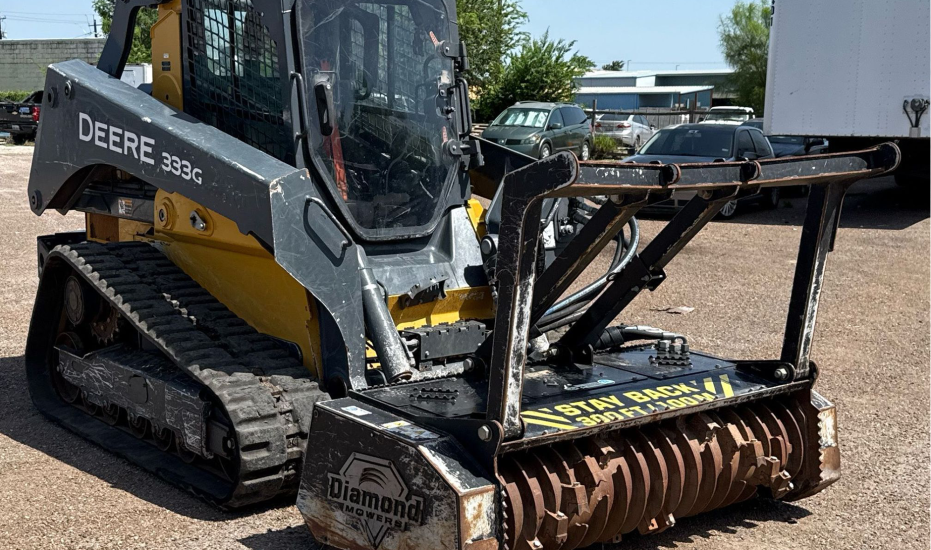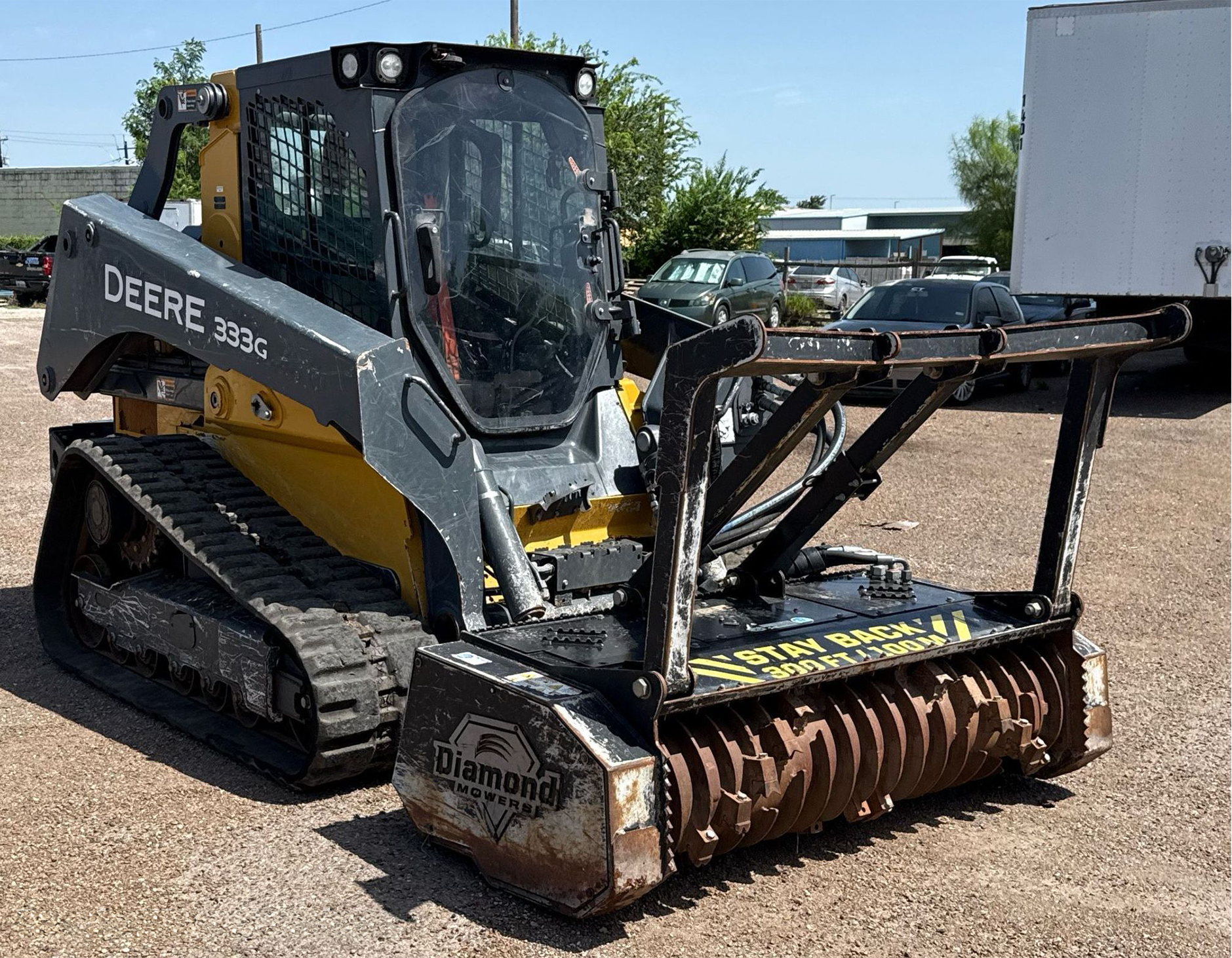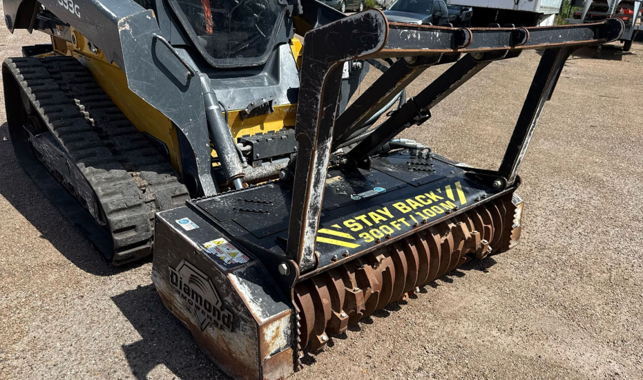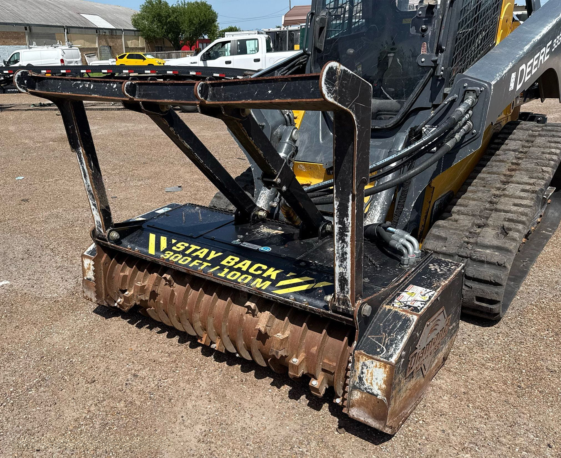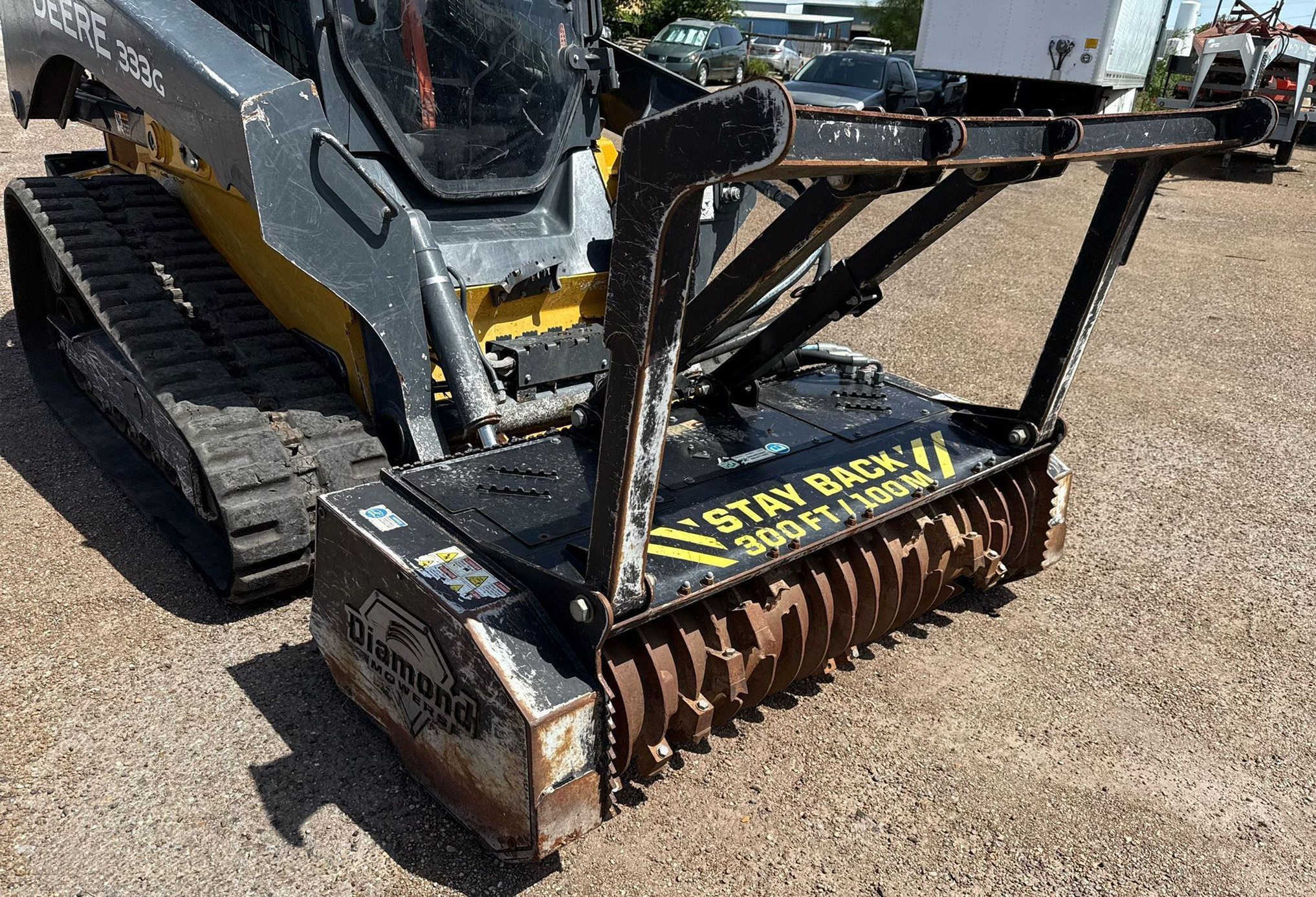 John Deere Compact Track Loader powered by a 4-cylinder John Deere diesel engine with hydrostatic transmission and two-speed travel. Features an enclosed cab with heat and A/C, backup camera, hand controls with pattern changer, and auxiliary hydraulics with electrical outlet. Equipped with a hydraulic quick coupler and 60½" Diamond Mowers mulcher, making it well suited for land clearing, mulching, and demanding attachment work.