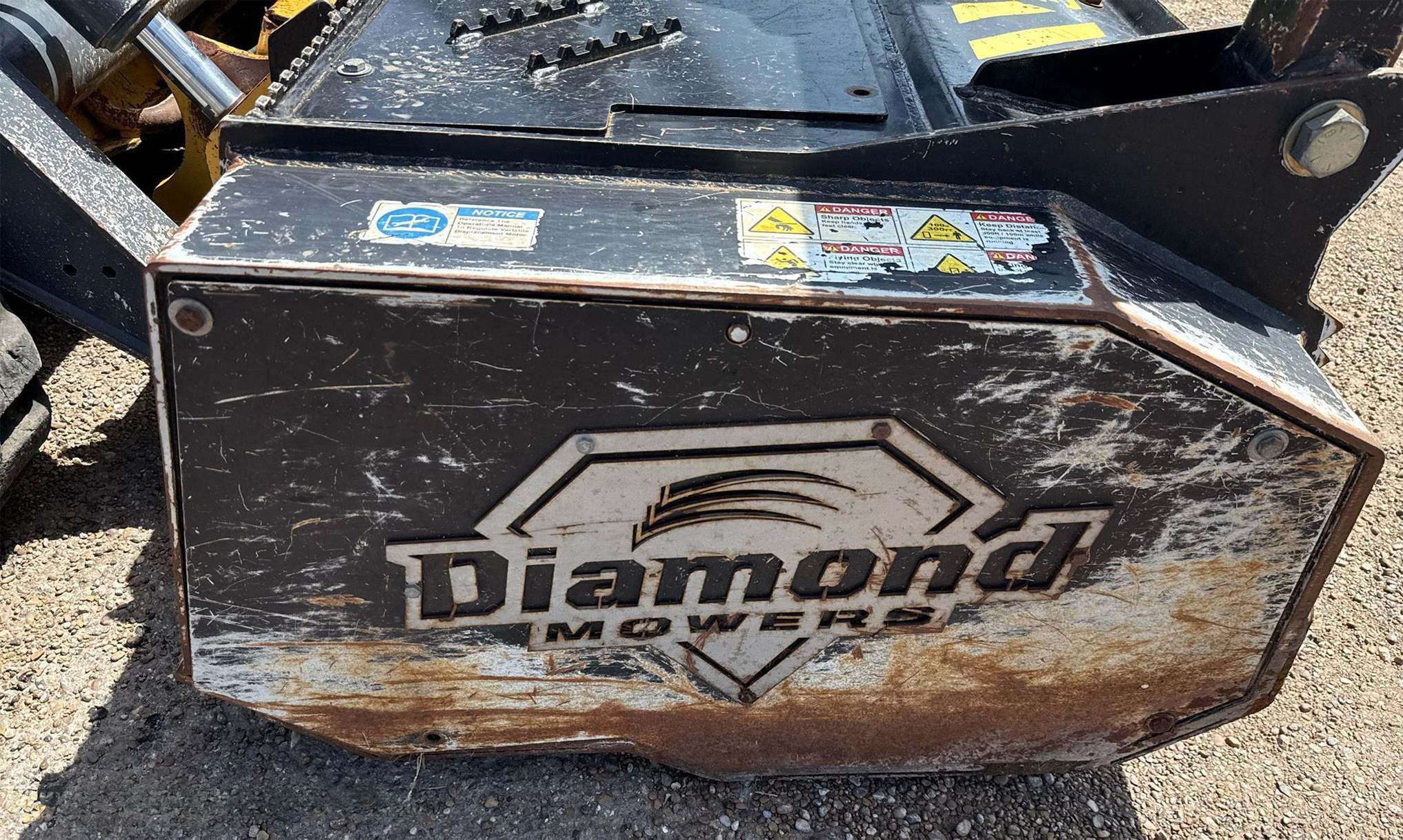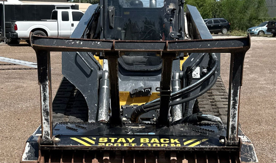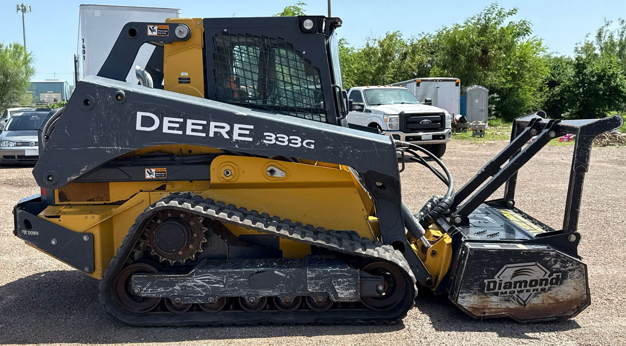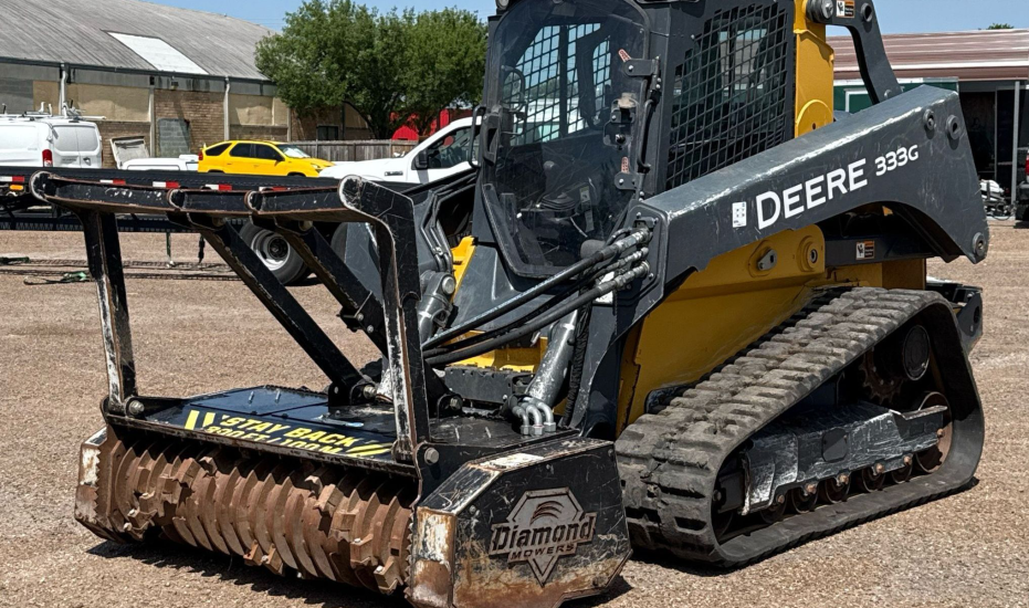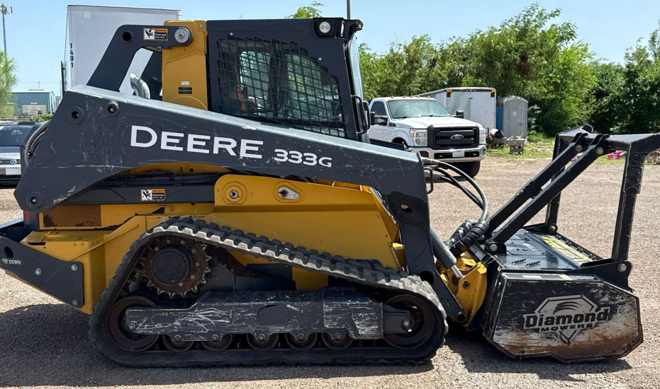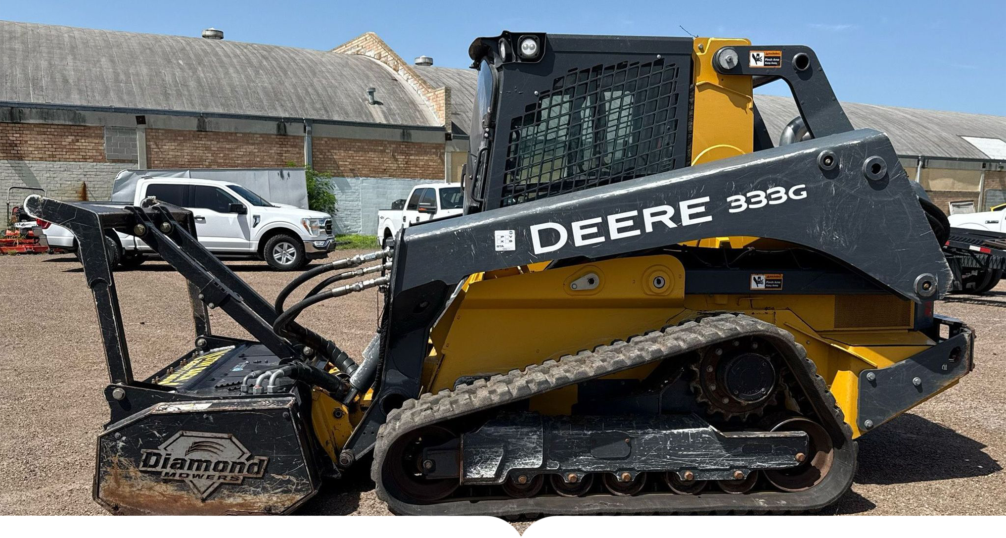 John Deere Compact Track Loader powered by a 4-cylinder John Deere diesel engine with hydrostatic transmission and two-speed travel. Features an enclosed cab with heat and A/C, backup camera, hand controls with pattern changer, and auxiliary hydraulics with electrical outlet. Equipped with a hydraulic quick coupler and 60½" Diamond Mowers mulcher, making it well suited for land clearing, mulching, and demanding attachment work.