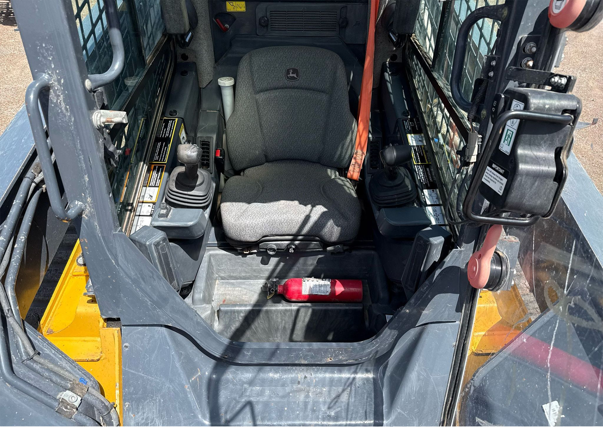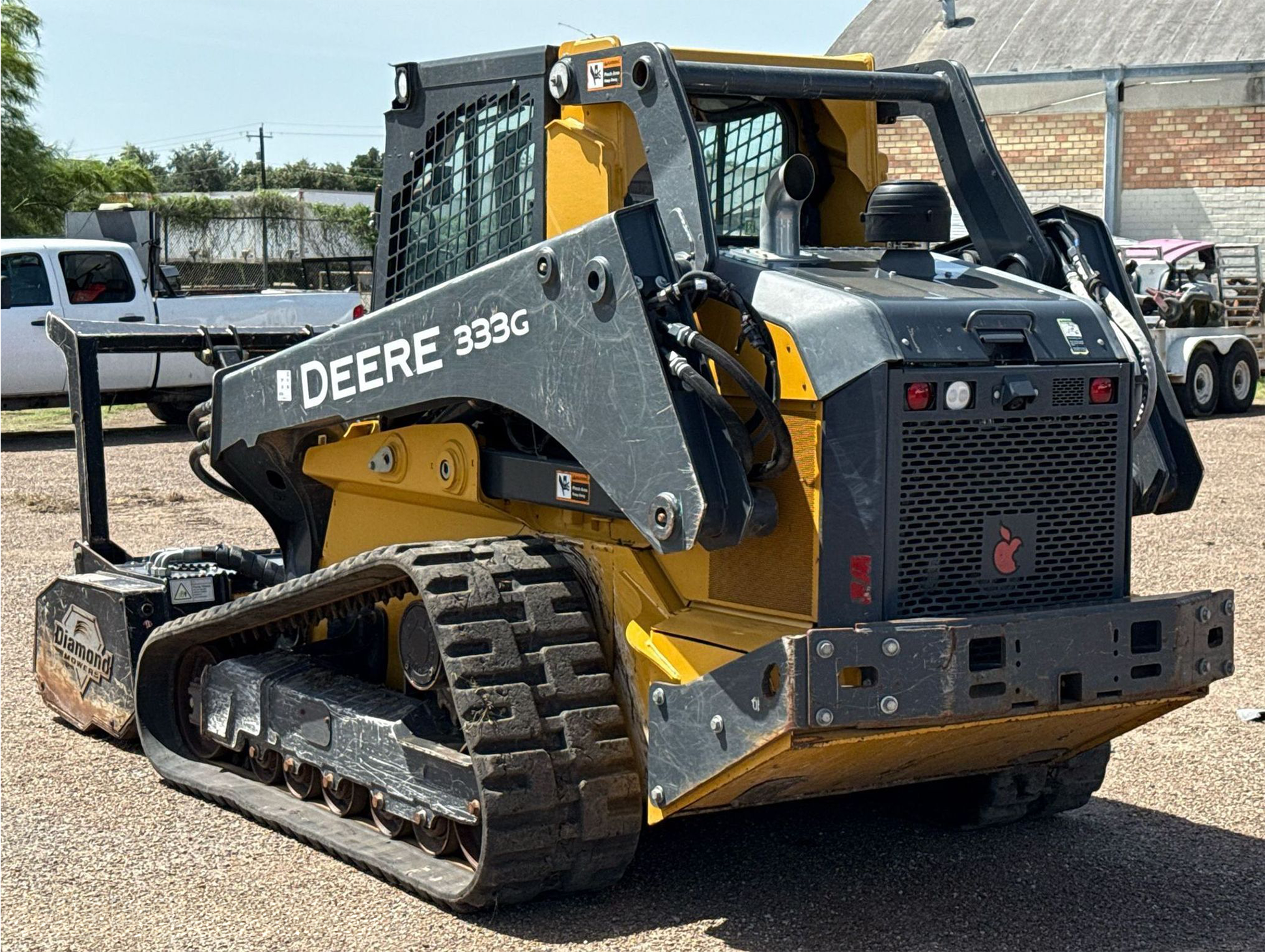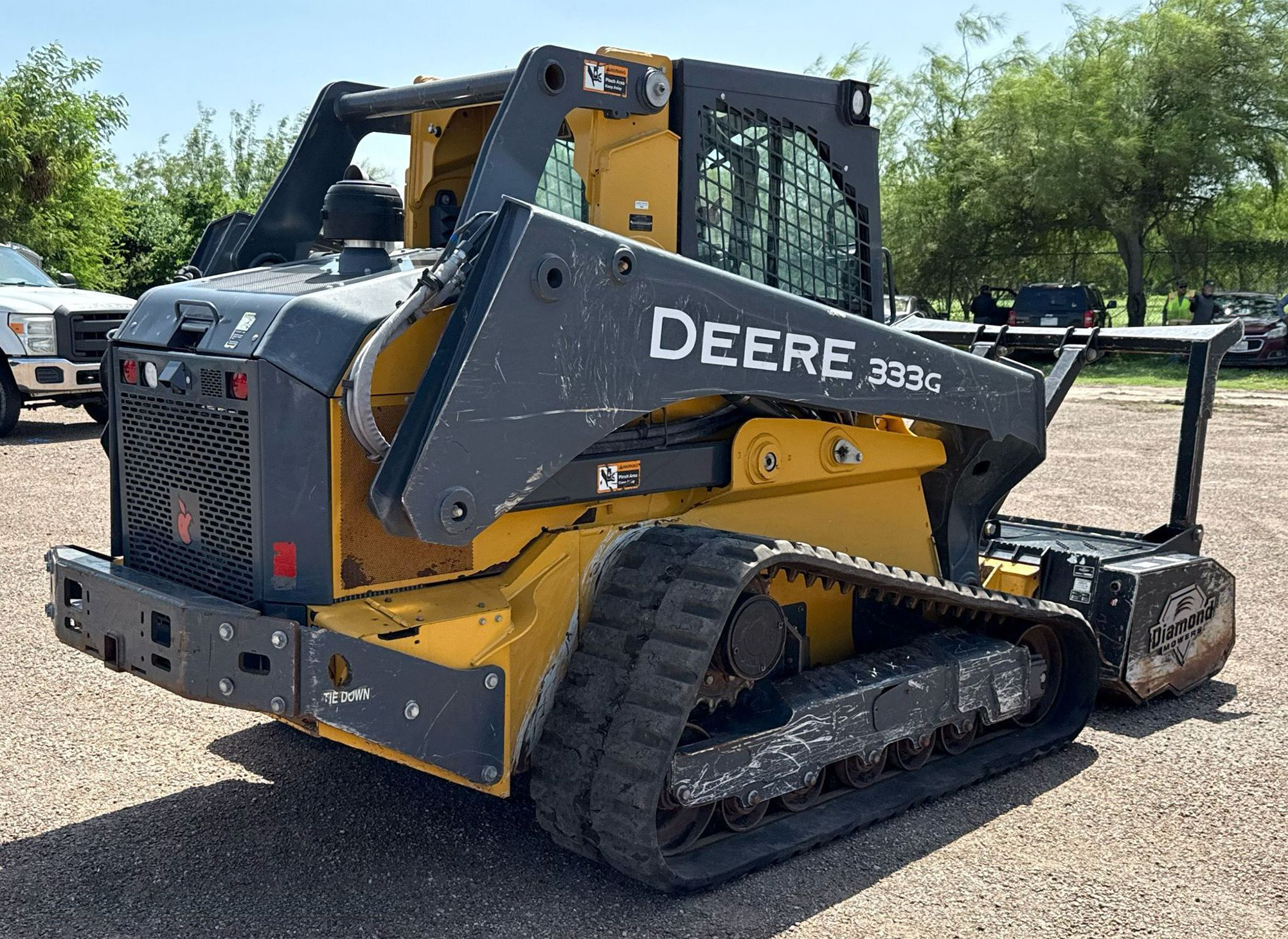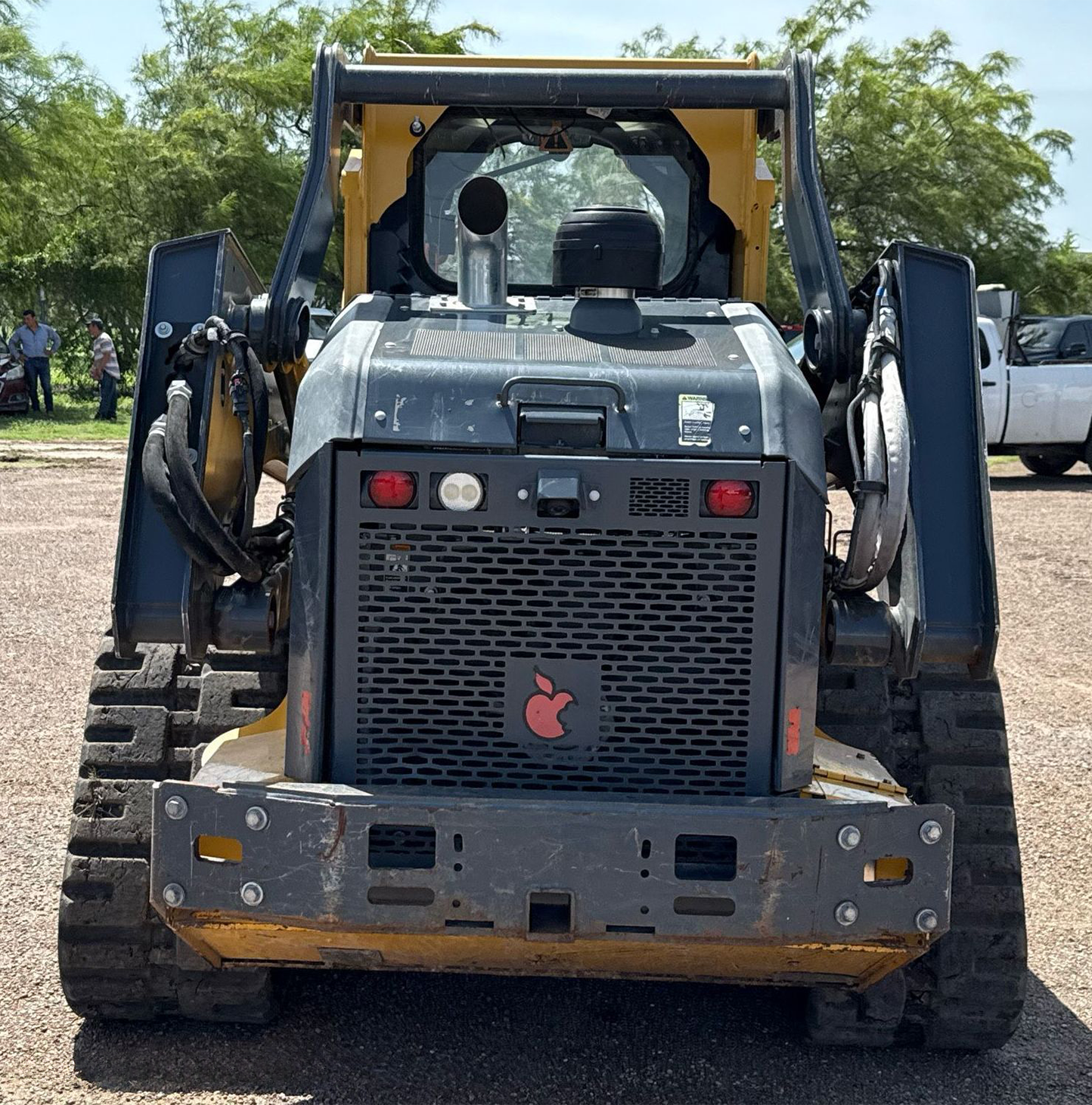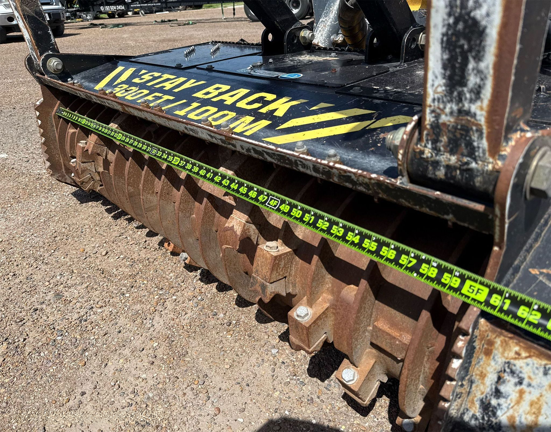 John Deere Compact Track Loader powered by a 4-cylinder John Deere diesel engine with hydrostatic transmission and two-speed travel. Features an enclosed cab with heat and A/C, backup camera, hand controls with pattern changer, and auxiliary hydraulics with electrical outlet. Equipped with a hydraulic quick coupler and 60½" Diamond Mowers mulcher, making it well suited for land clearing, mulching, and demanding attachment work.