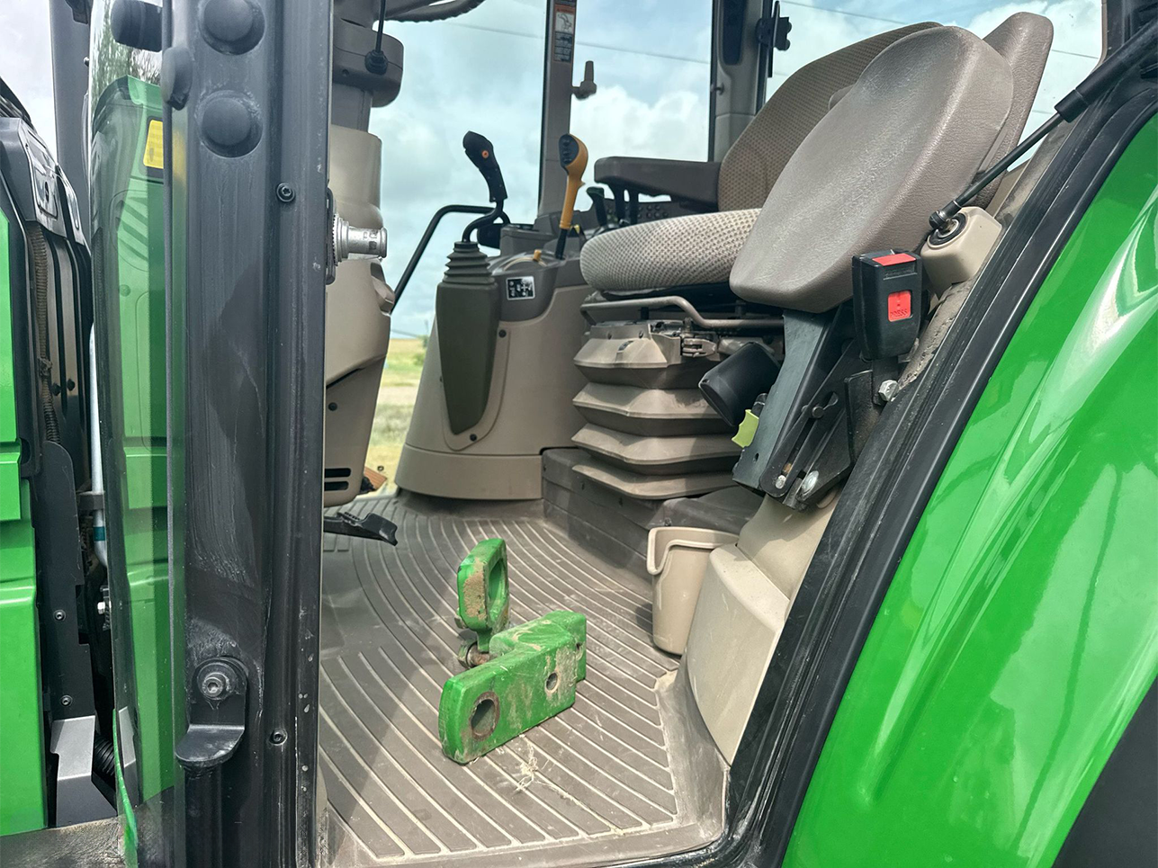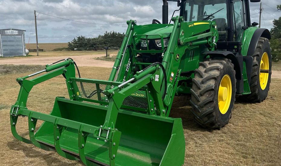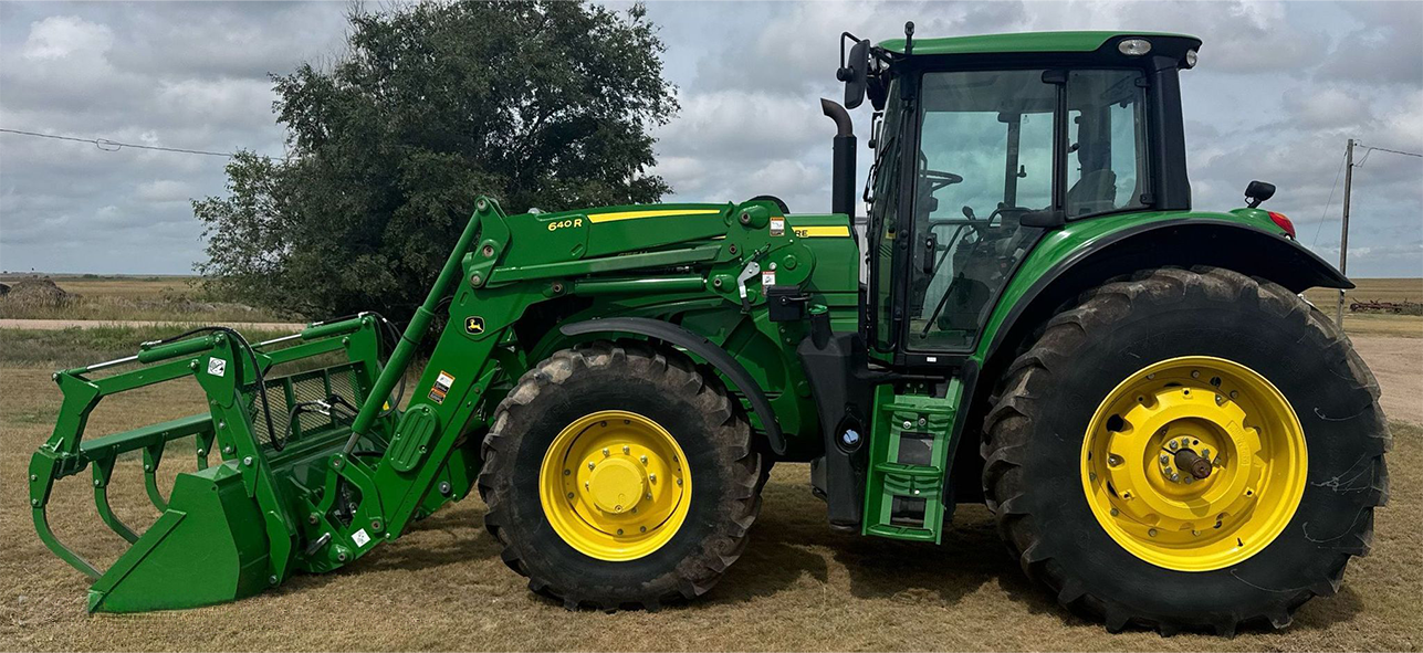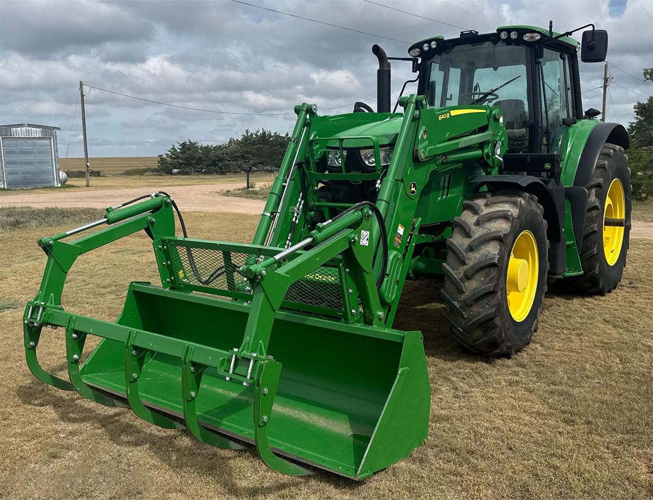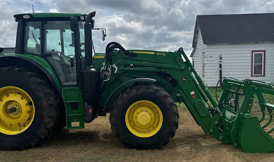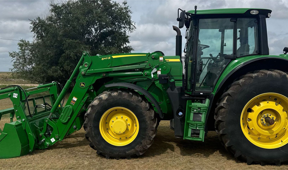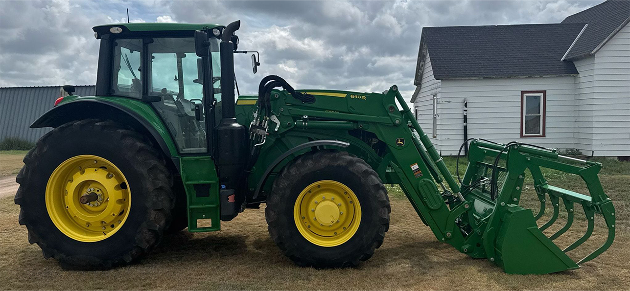 John Deere Tractor powered by a 6.8L 6-cylinder PowerTech PVS diesel engine with powershift transmission (20F/20R) and left-hand reverser. Features differential lock, AC and heat, and a 1000 PTO. Equipped with three-point hitch, top link, seven-pin and ISOBUS outlets, and 3 rear hydraulic remotes. Comes with a John Deere 640R loader with quick attach and joystick controls, and a 99" bucket. Tires are 420/85R28 front and 520/85R38 rear with 2 wheel weights—ready for heavy-duty field and loader work.