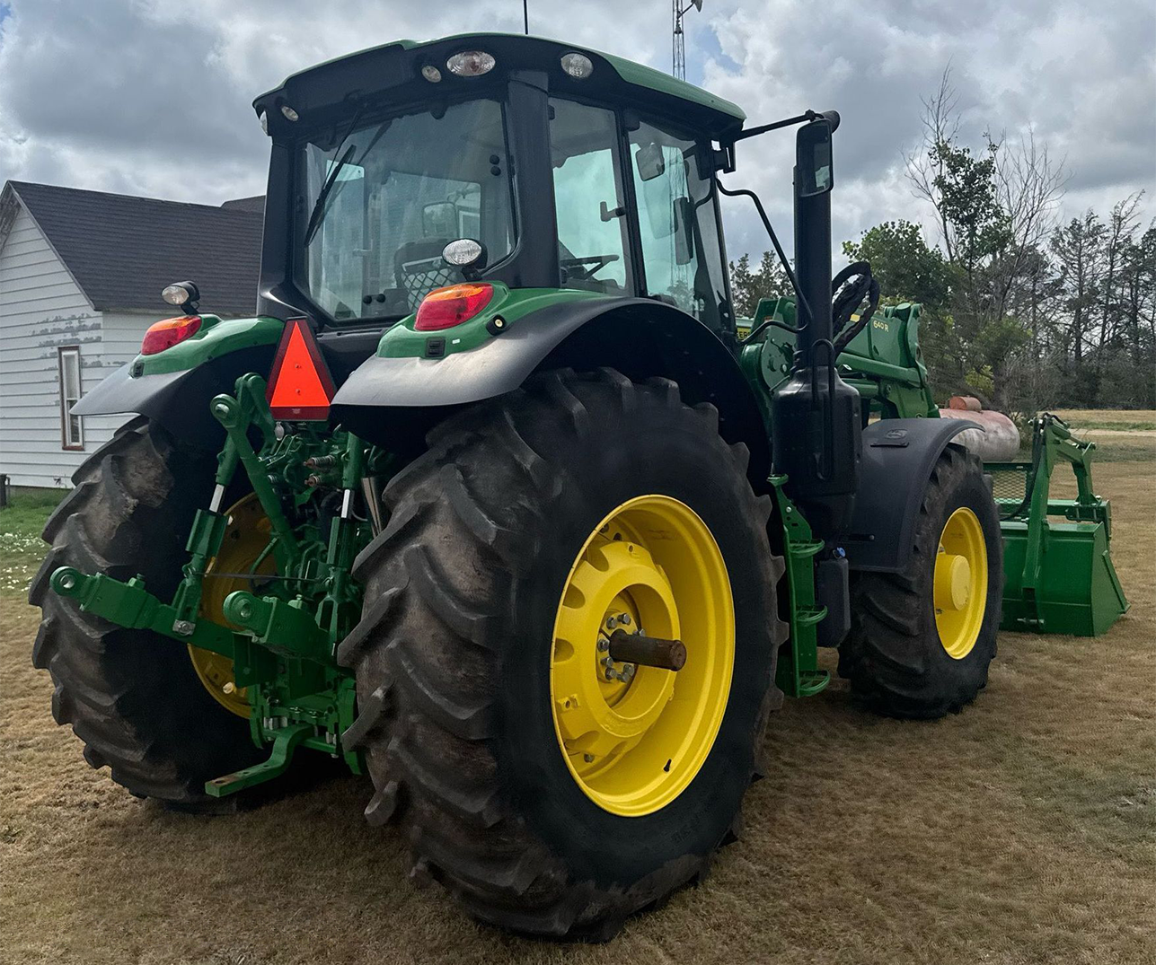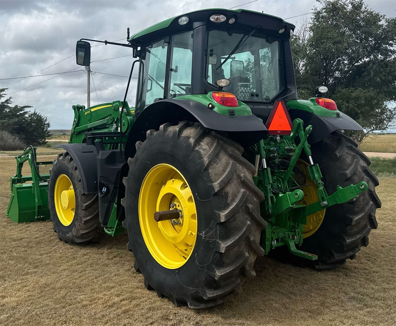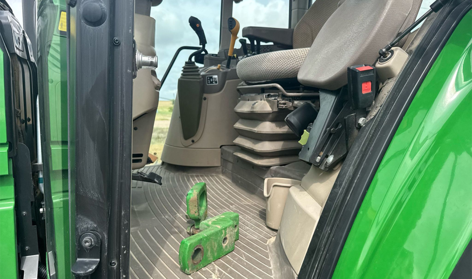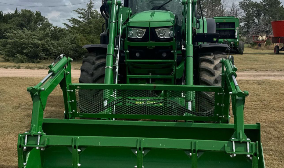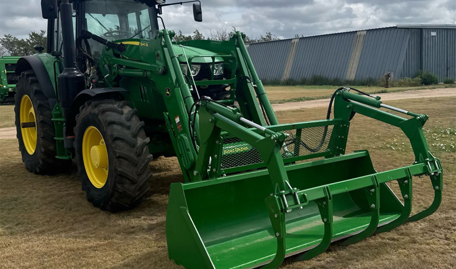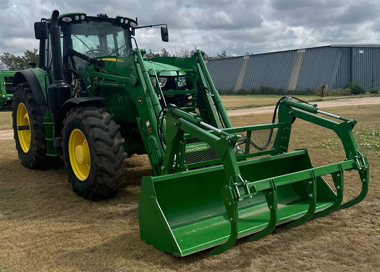 John Deere Tractor powered by a 6.8L 6-cylinder PowerTech PVS diesel engine with powershift transmission (20F/20R) and left-hand reverser. Features differential lock, AC and heat, and a 1000 PTO. Equipped with three-point hitch, top link, seven-pin and ISOBUS outlets, and 3 rear hydraulic remotes. Comes with a John Deere 640R loader with quick attach and joystick controls, and a 99" bucket. Tires are 420/85R28 front and 520/85R38 rear with 2 wheel weights—ready for heavy-duty field and loader work.