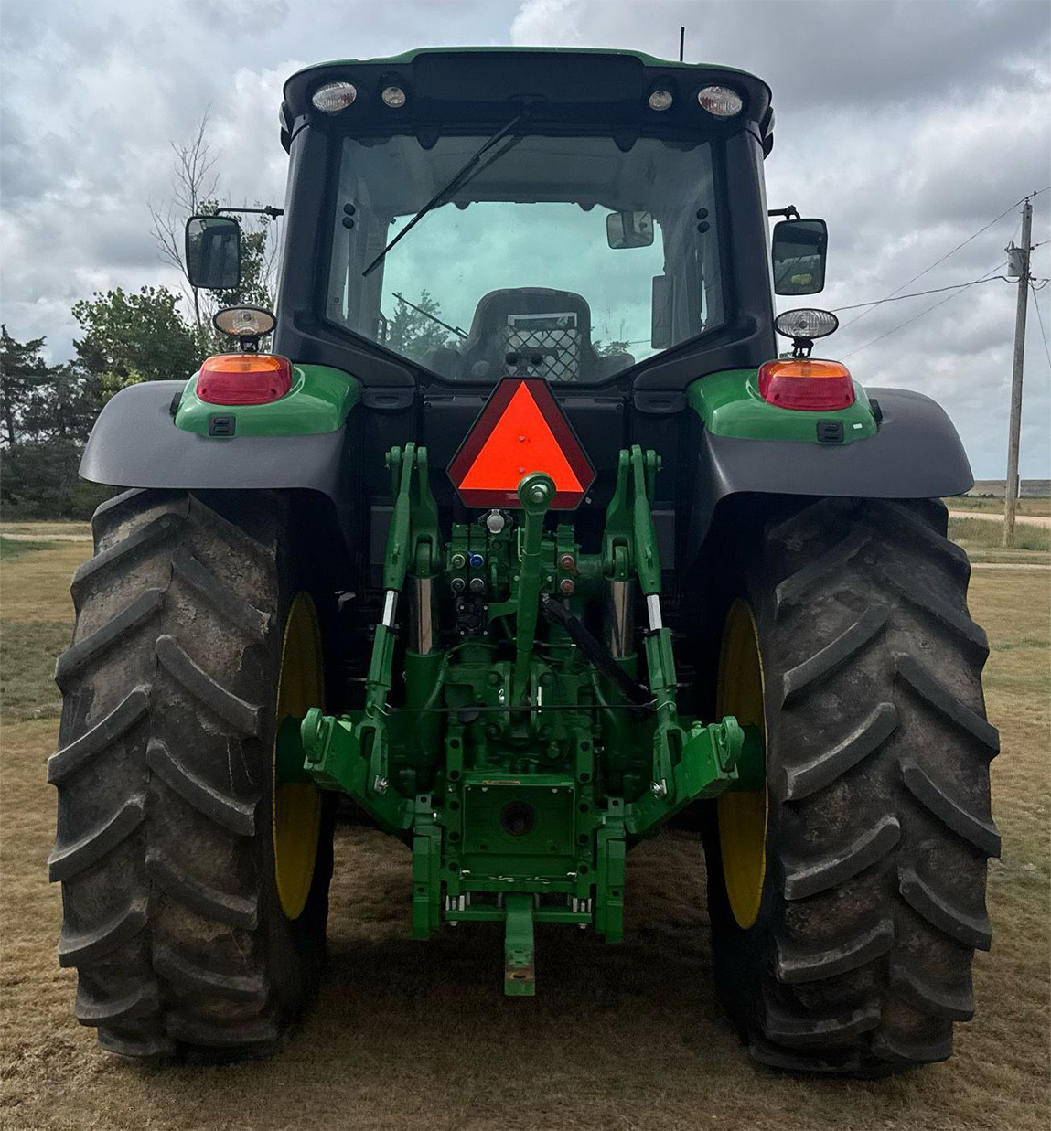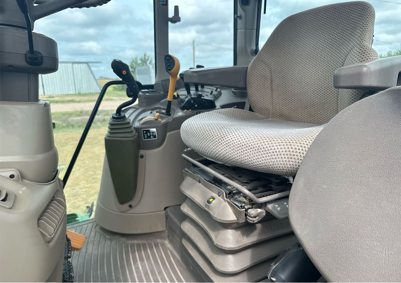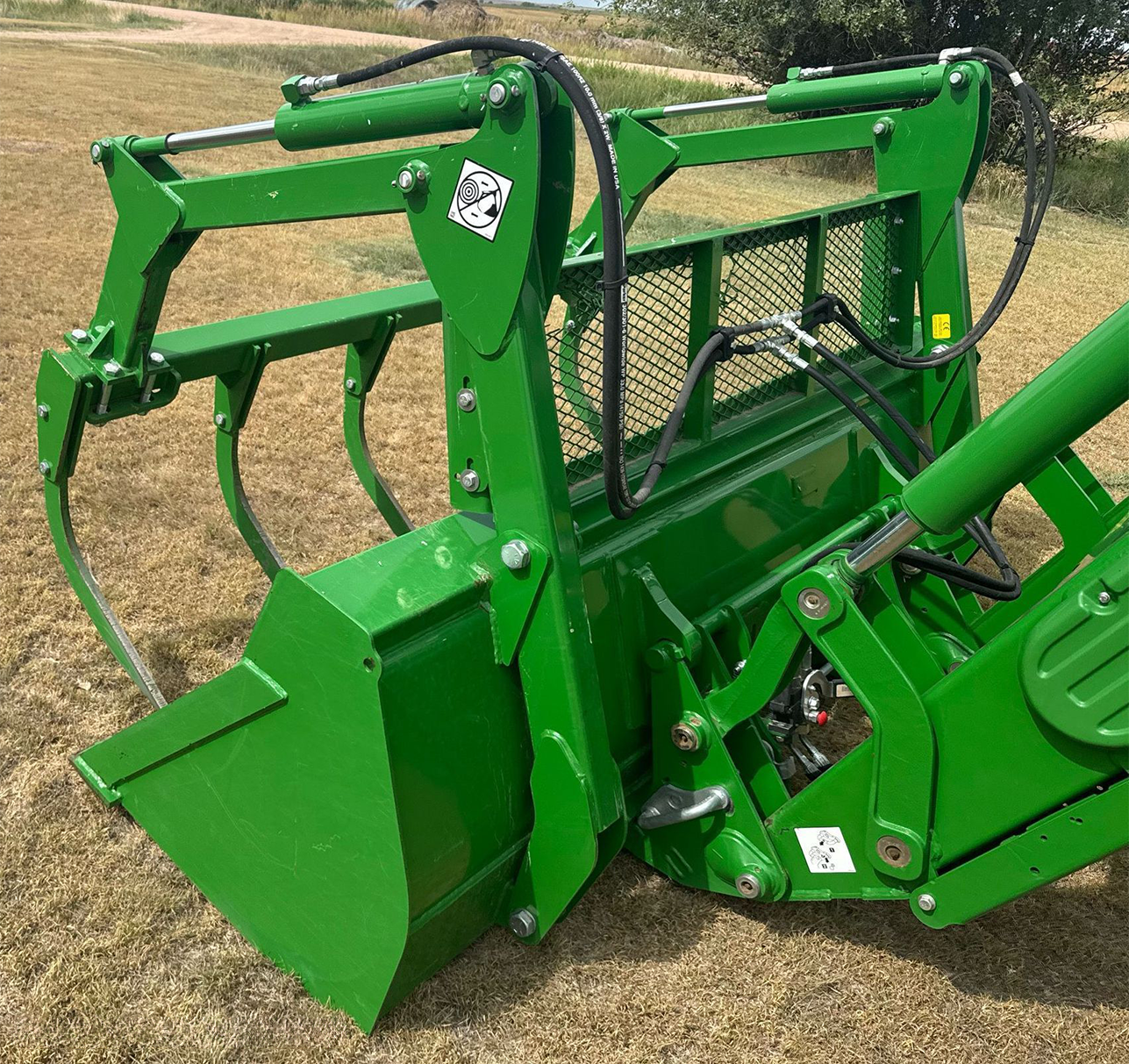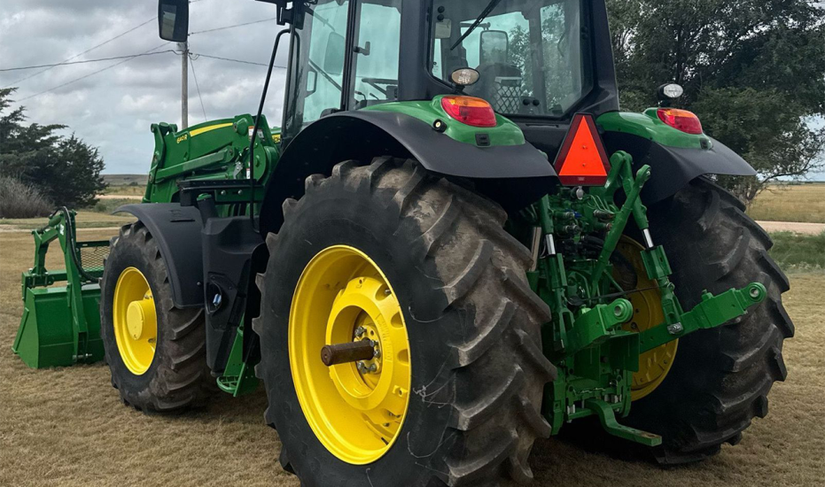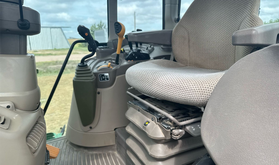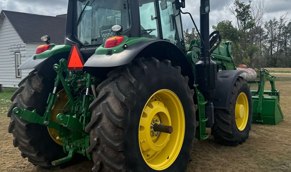 John Deere Tractor powered by a 6.8L 6-cylinder PowerTech PVS diesel engine with powershift transmission (20F/20R) and left-hand reverser. Features differential lock, AC and heat, and a 1000 PTO. Equipped with three-point hitch, top link, seven-pin and ISOBUS outlets, and 3 rear hydraulic remotes. Comes with a John Deere 640R loader with quick attach and joystick controls, and a 99" bucket. Tires are 420/85R28 front and 520/85R38 rear with 2 wheel weights—ready for heavy-duty field and loader work.