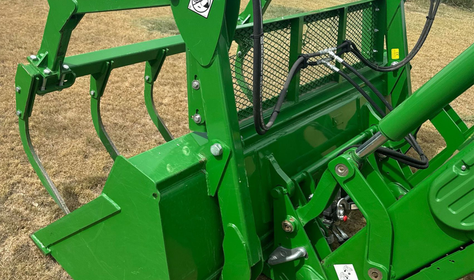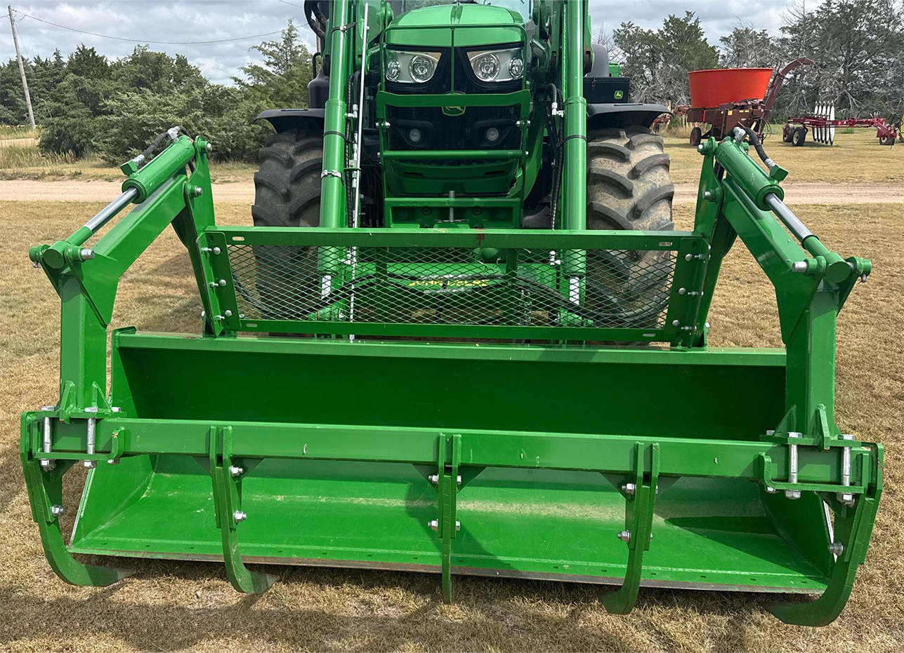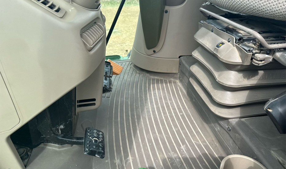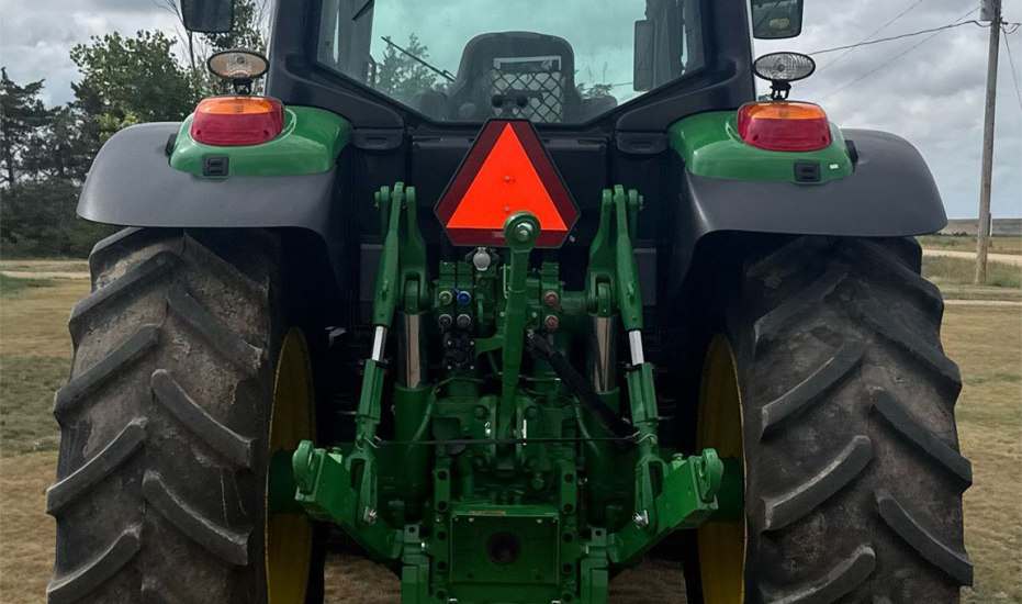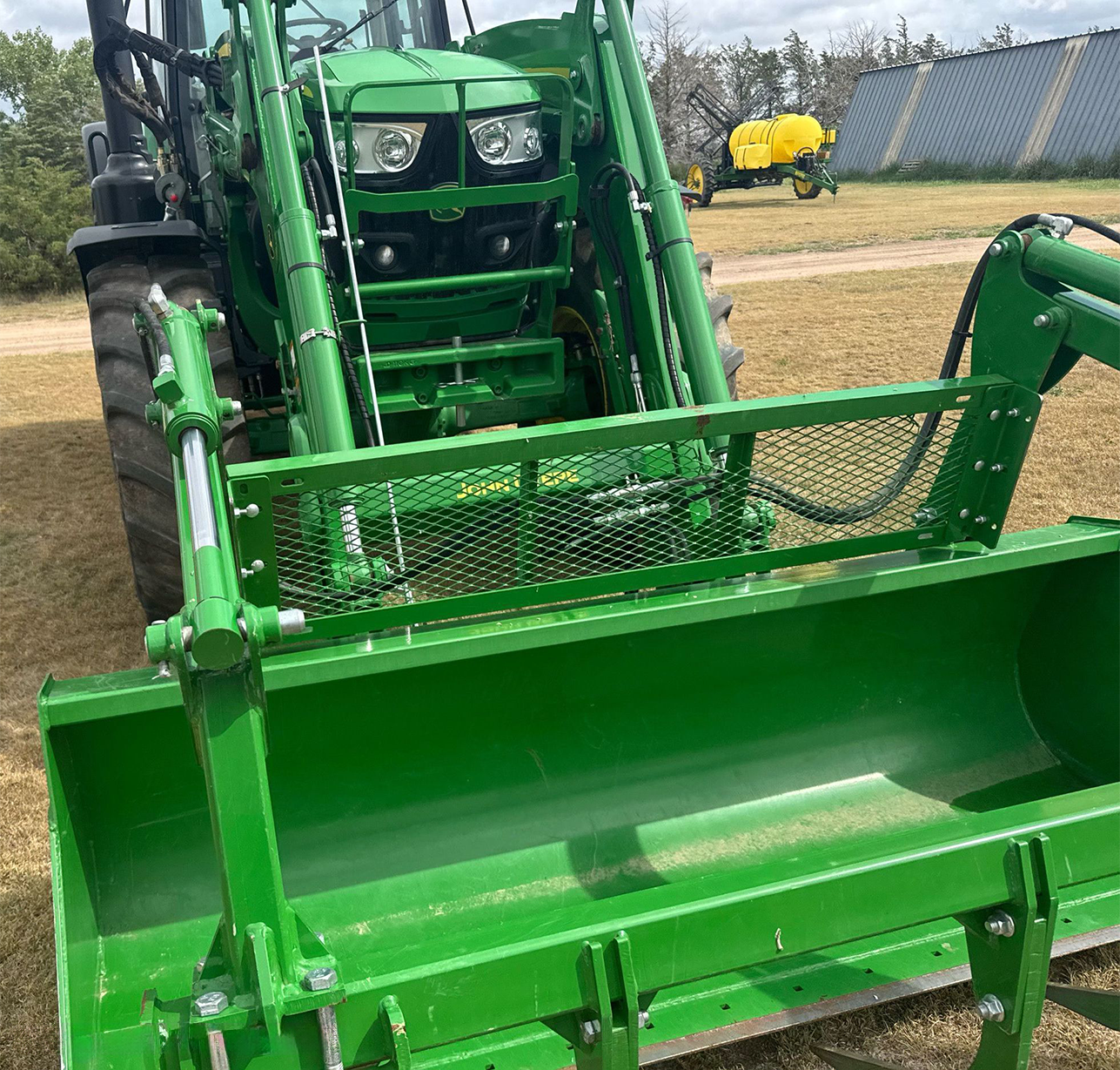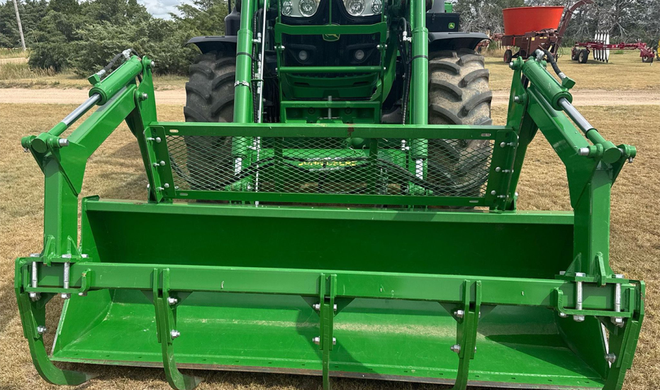 John Deere Tractor powered by a 6.8L 6-cylinder PowerTech PVS diesel engine with powershift transmission (20F/20R) and left-hand reverser. Features differential lock, AC and heat, and a 1000 PTO. Equipped with three-point hitch, top link, seven-pin and ISOBUS outlets, and 3 rear hydraulic remotes. Comes with a John Deere 640R loader with quick attach and joystick controls, and a 99" bucket. Tires are 420/85R28 front and 520/85R38 rear with 2 wheel weights—ready for heavy-duty field and loader work.