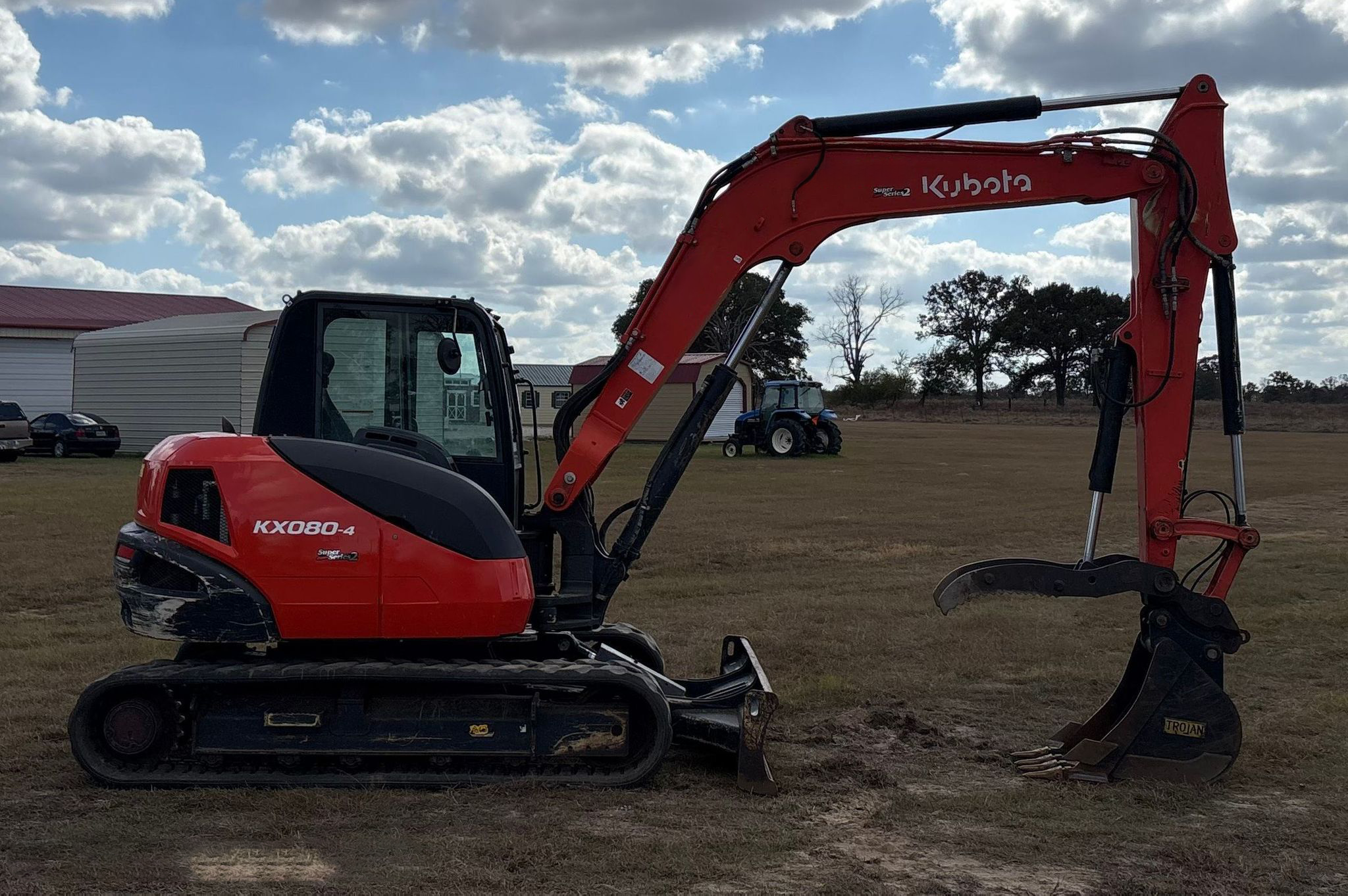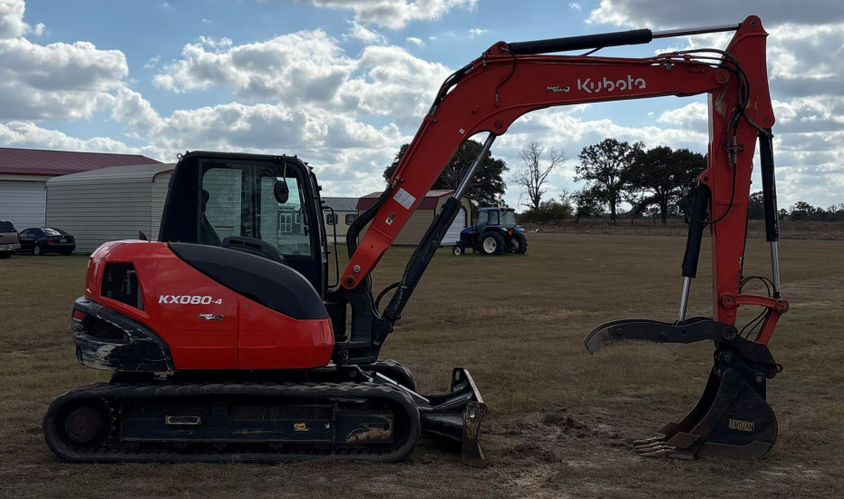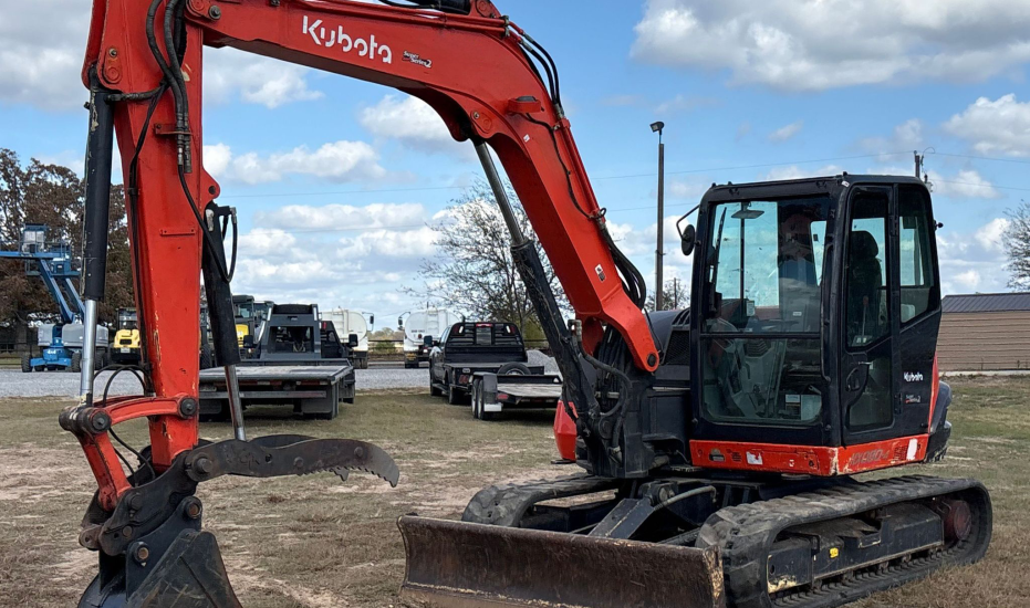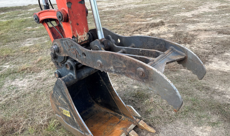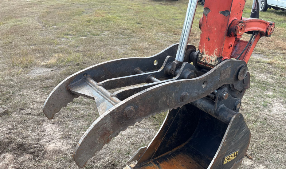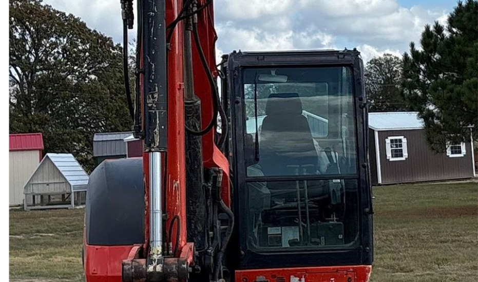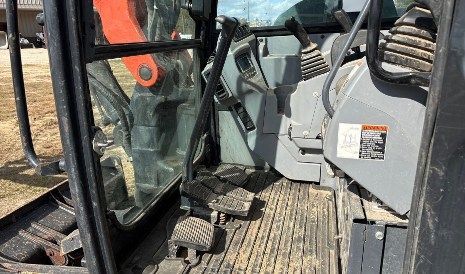 Compact Excavator powered by a Kubota V3307-1 3.3L 4-cylinder diesel engine. Features a hydrostatic transmission and an enclosed cab with heat and A/C for all-day comfort. Equipped with standard auxiliary hydraulics, counterweights, and an 87" backfill blade. Includes a swing boom, 87" stick, hydraulic quick coupler, hydraulic thumb, and a 22" Trojan bucket with 4 teeth. Rides on 17" rubber tracks, making it a solid, versatile machine for excavation and utility work.
