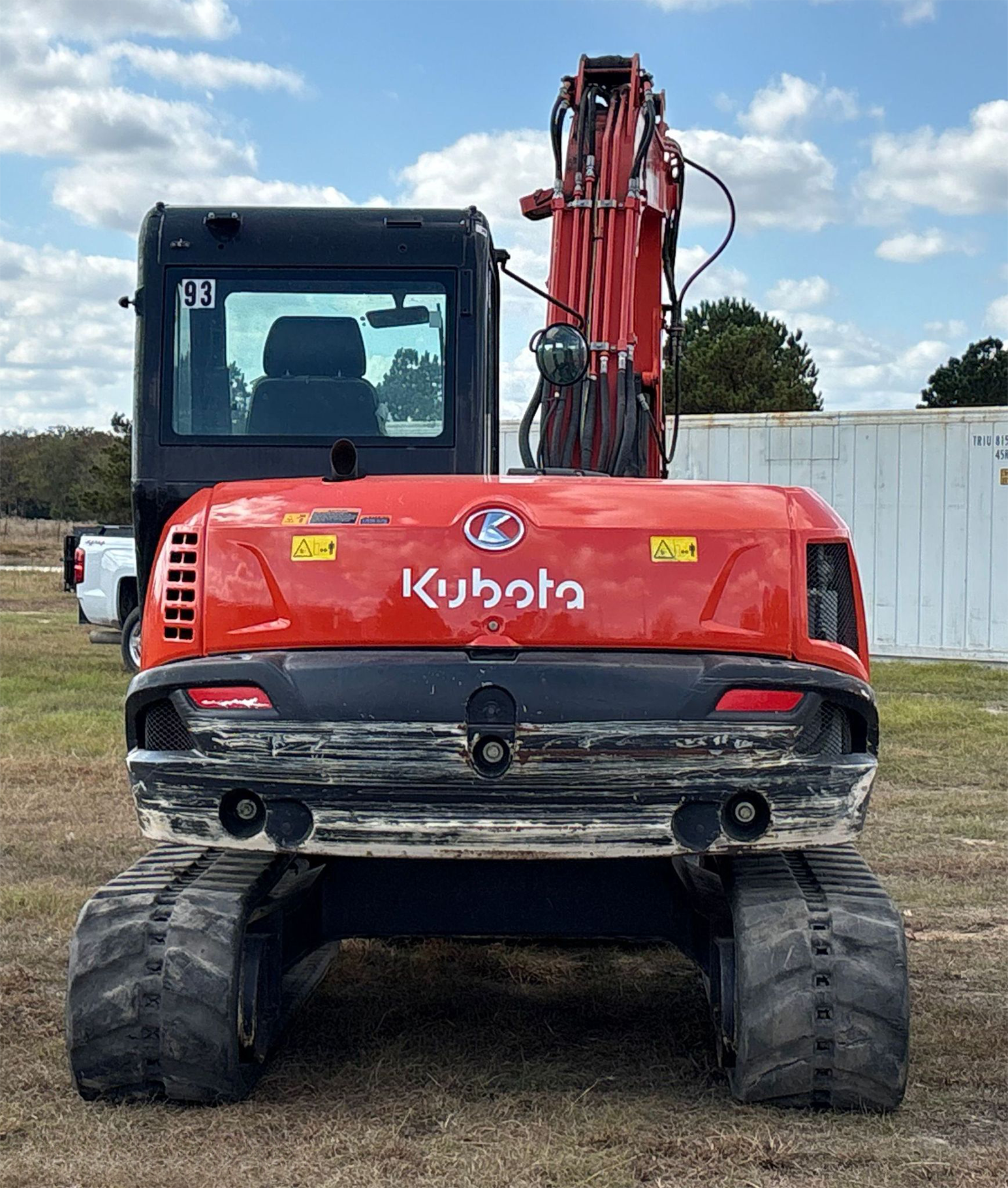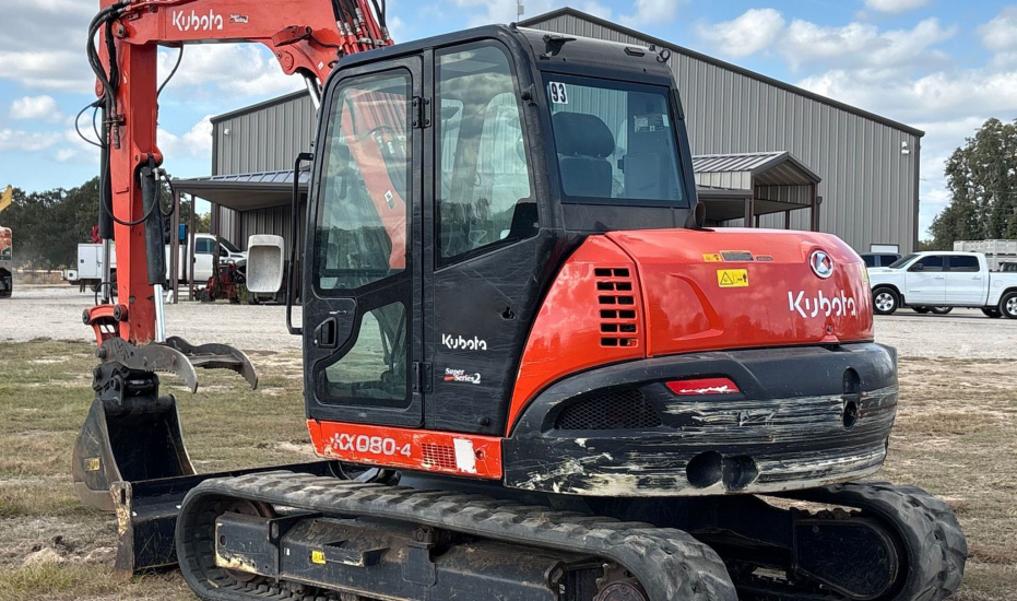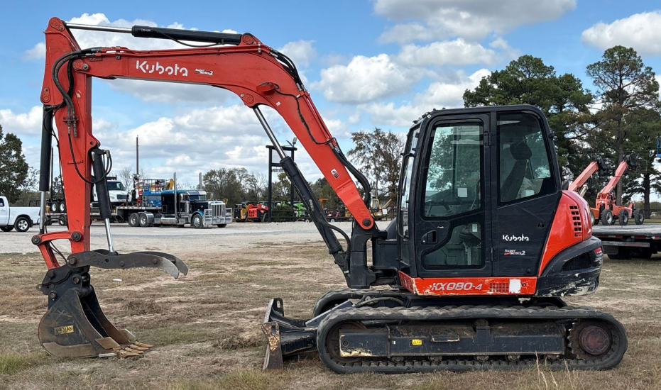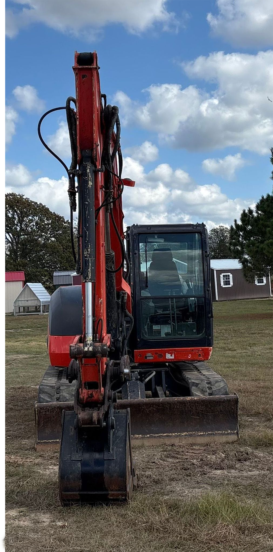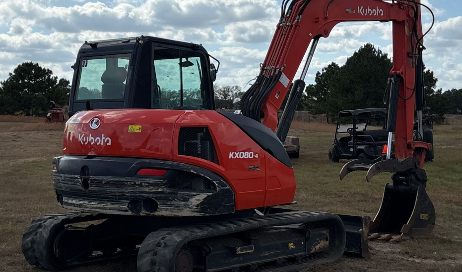 Compact Excavator powered by a Kubota V3307-1 3.3L 4-cylinder diesel engine. Features a hydrostatic transmission and an enclosed cab with heat and A/C for all-day comfort. Equipped with standard auxiliary hydraulics, counterweights, and an 87" backfill blade. Includes a swing boom, 87" stick, hydraulic quick coupler, hydraulic thumb, and a 22" Trojan bucket with 4 teeth. Rides on 17" rubber tracks, making it a solid, versatile machine for excavation and utility work.