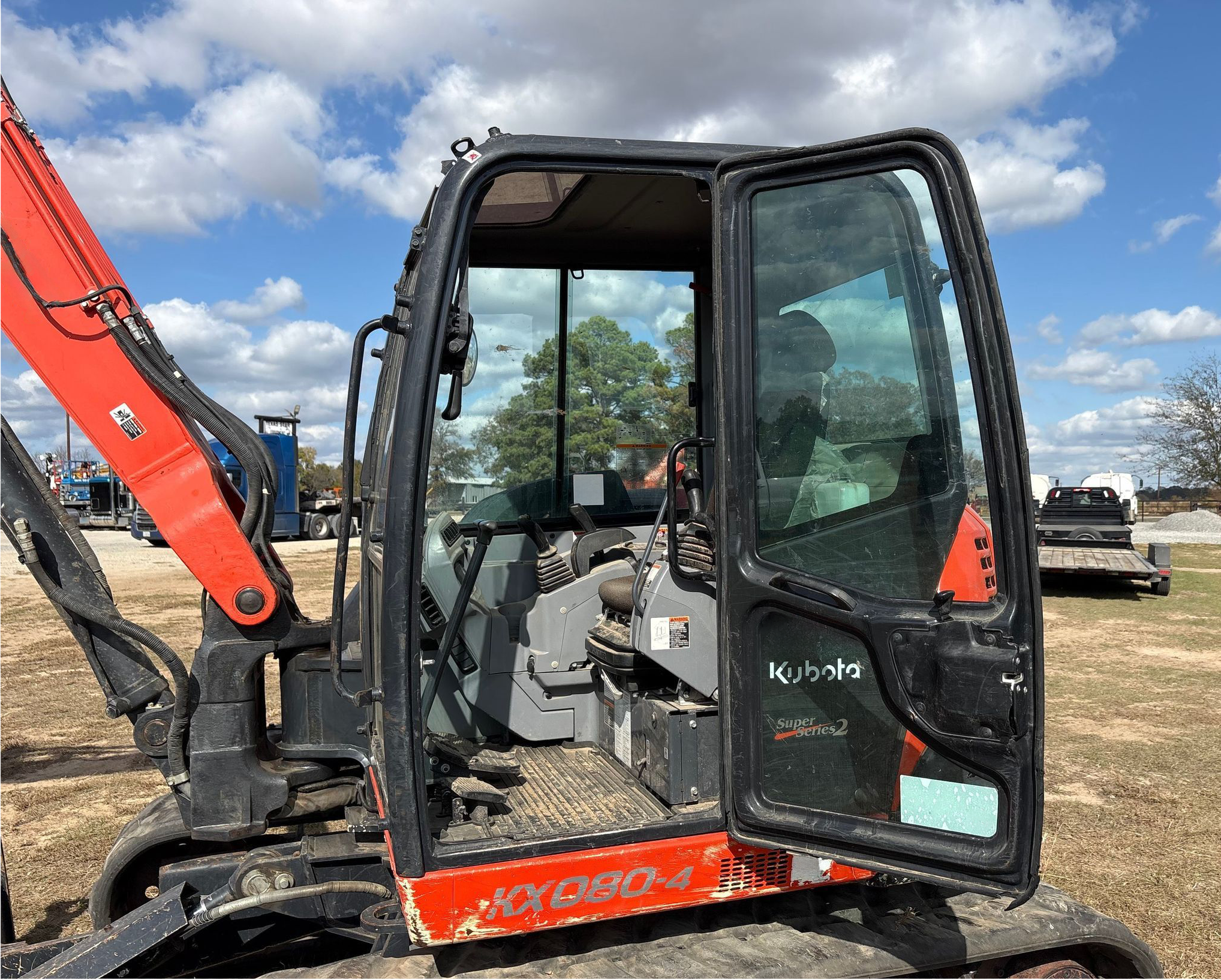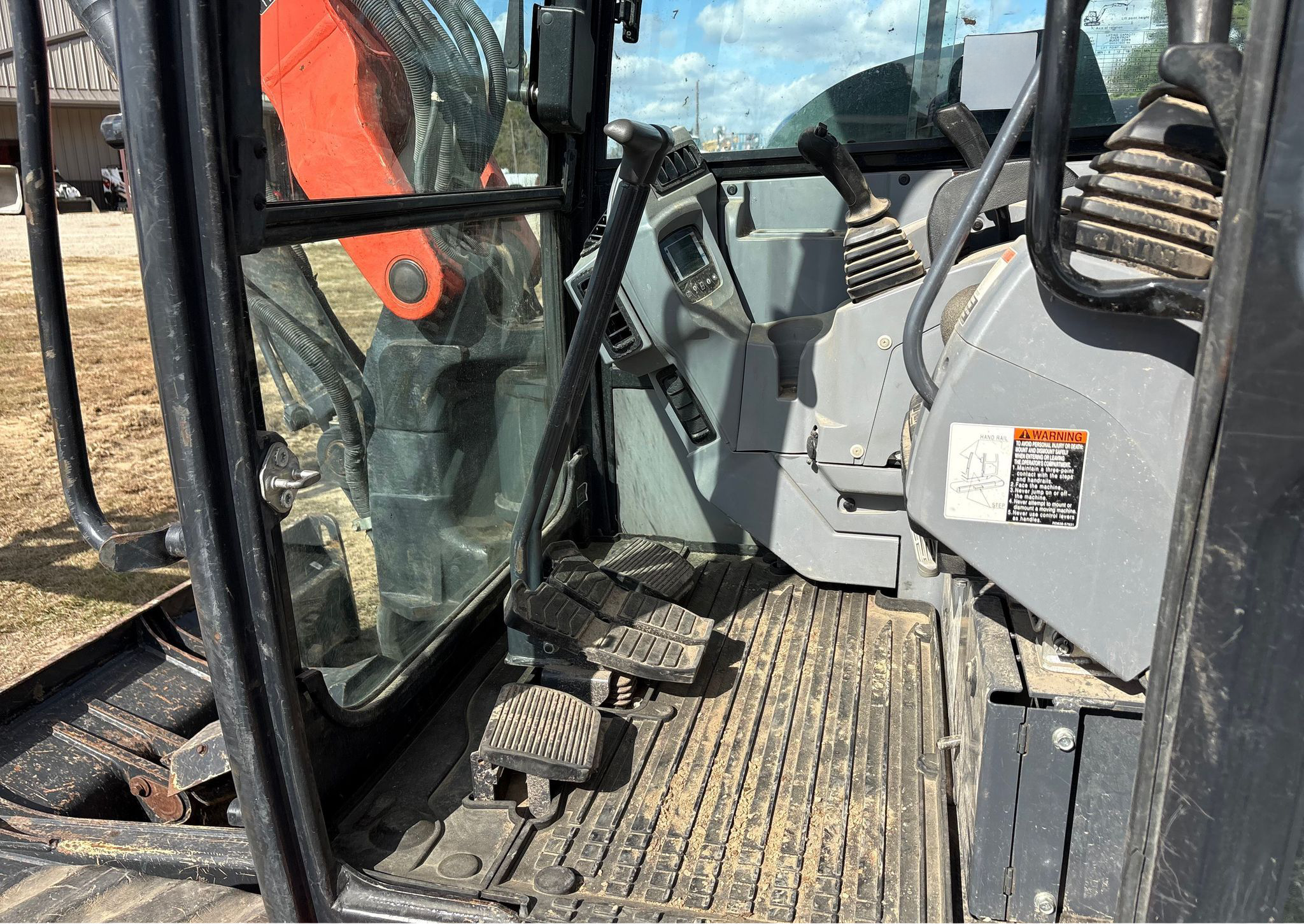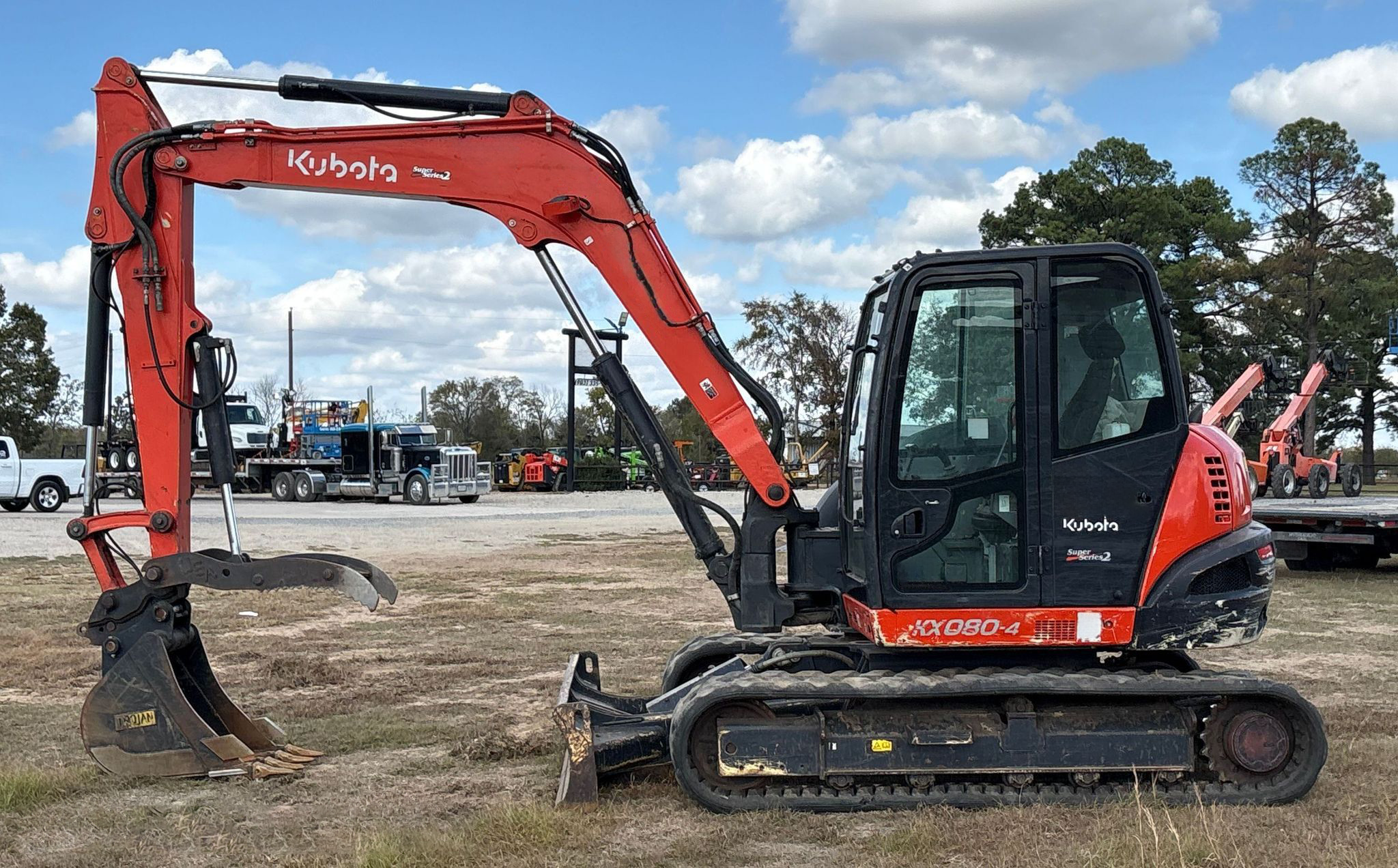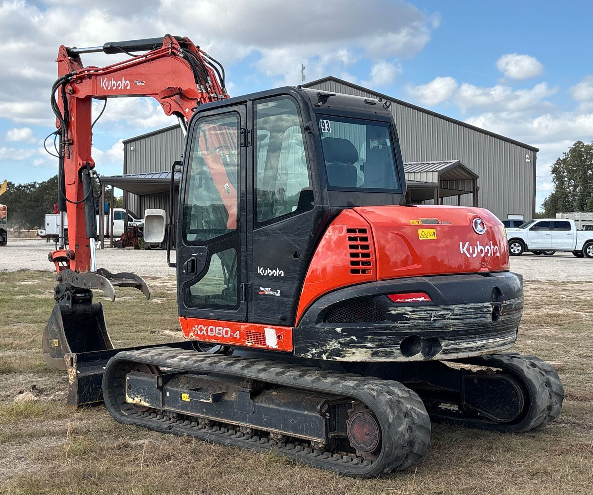 Compact Excavator powered by a Kubota V3307-1 3.3L 4-cylinder diesel engine. Features a hydrostatic transmission and an enclosed cab with heat and A/C for all-day comfort. Equipped with standard auxiliary hydraulics, counterweights, and an 87" backfill blade. Includes a swing boom, 87" stick, hydraulic quick coupler, hydraulic thumb, and a 22" Trojan bucket with 4 teeth. Rides on 17" rubber tracks, making it a solid, versatile machine for excavation and utility work.